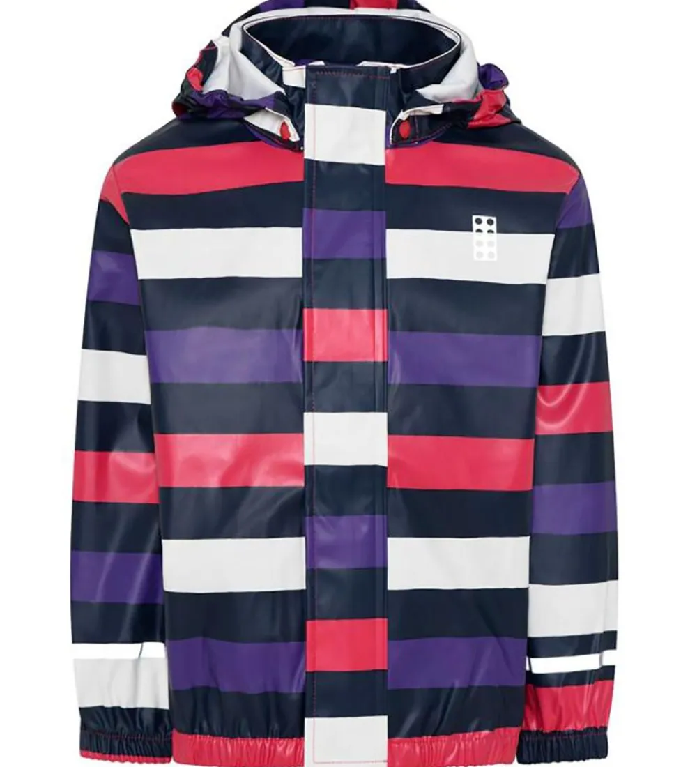 Smart LEGO® Wear regnjakke med vandrette striber i mørk lilla, Hvid, fuchsia og lilla, og regnjakken er lavet af PU.