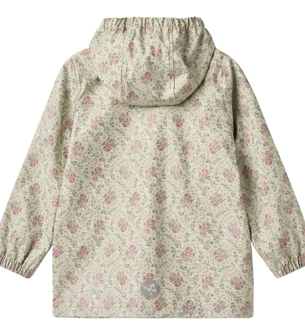 Skøn Wheat regnjakke af PU i lys grøm med et blomstret alloverprint i rosa, hvide og grønne nuancer.