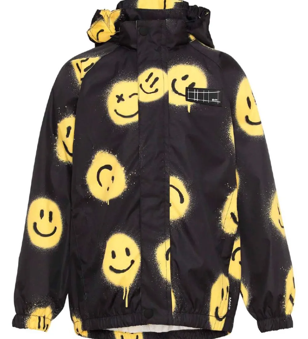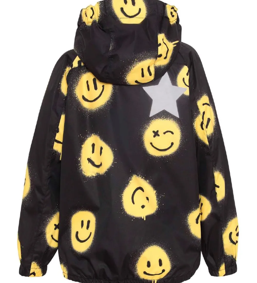 Lækker Molo regnjakke i sort med et alloverprint af smileys i et gult grafitti-design samt med en sort gummiapplikation med et hvidt gittermønster.
