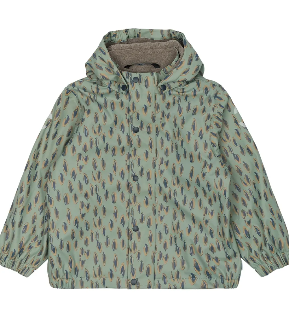 Sejt Mikk-Line regntøj af PU bestående af en regnjakke og et par regnbukser med seler. Regnbukserne er i ensfarvet mørkeblå, mens regnjakken er i støvet grøn med et fjerlignende alloverprint i burne nuancer og navyblå.