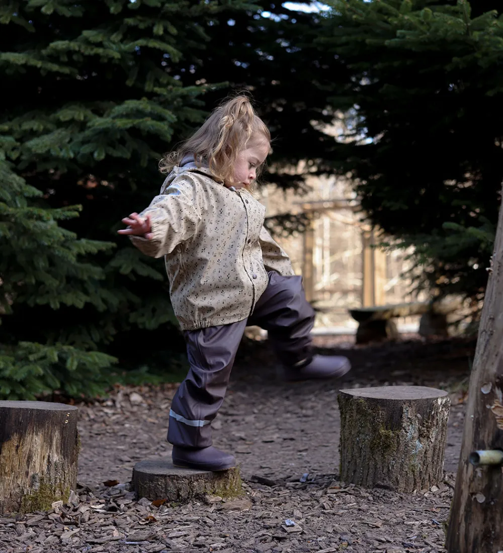 OBS: fra str. 110 (5 år) og opefter er regntøjet med regnbukser uden seler. Regnbukserne har i stedet en indvendigt justerbar elastikkant i livet.