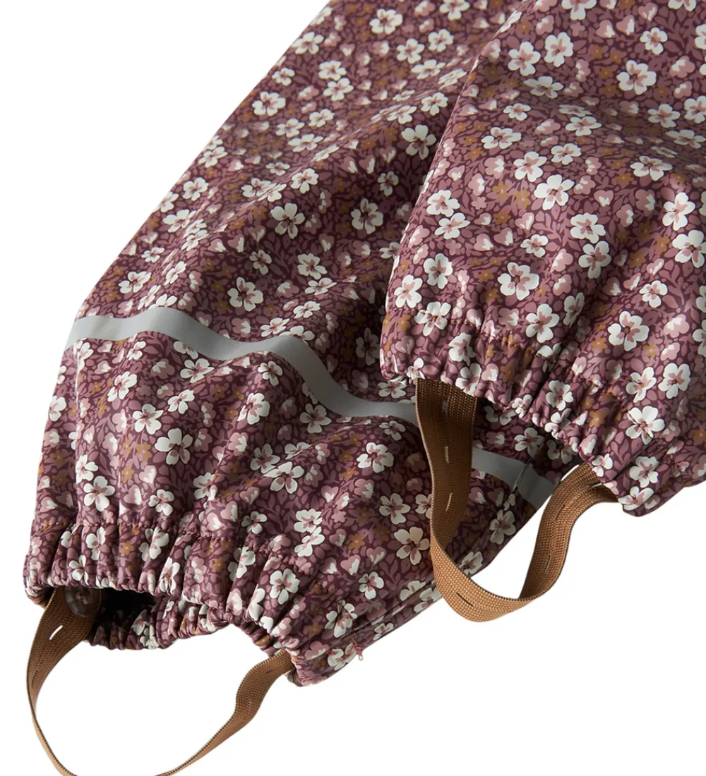 Buksebenene har en brede elastikkanter samt justerbare, aftagelige elastikstropper til at sættes under gummistøvlerne. Rundt om højre ærme og bukseben er der en refleks-stribe.