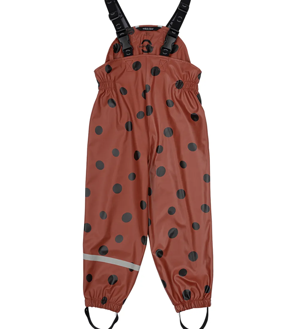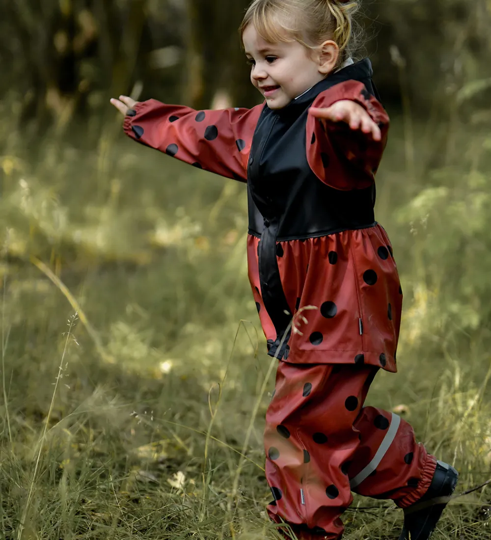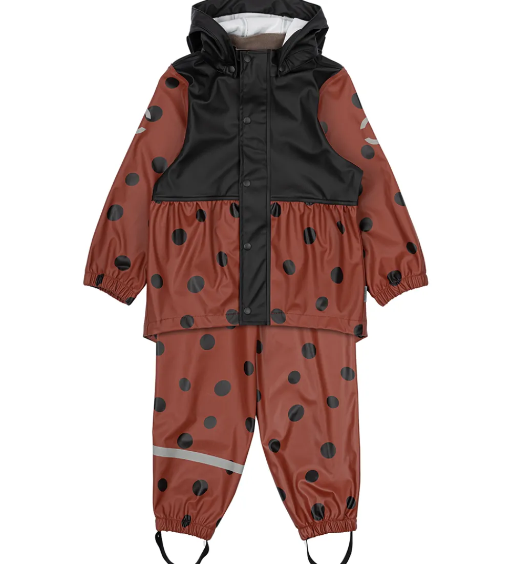 Sejt Mikk-Line regntøj af PU bestående af et par regnbukser med seler og en regnjakke. Regntøjet er mørk rødbrun og sort og i et mariehønedesign, som er lavet, så det ligner et mariehøne-kostume.