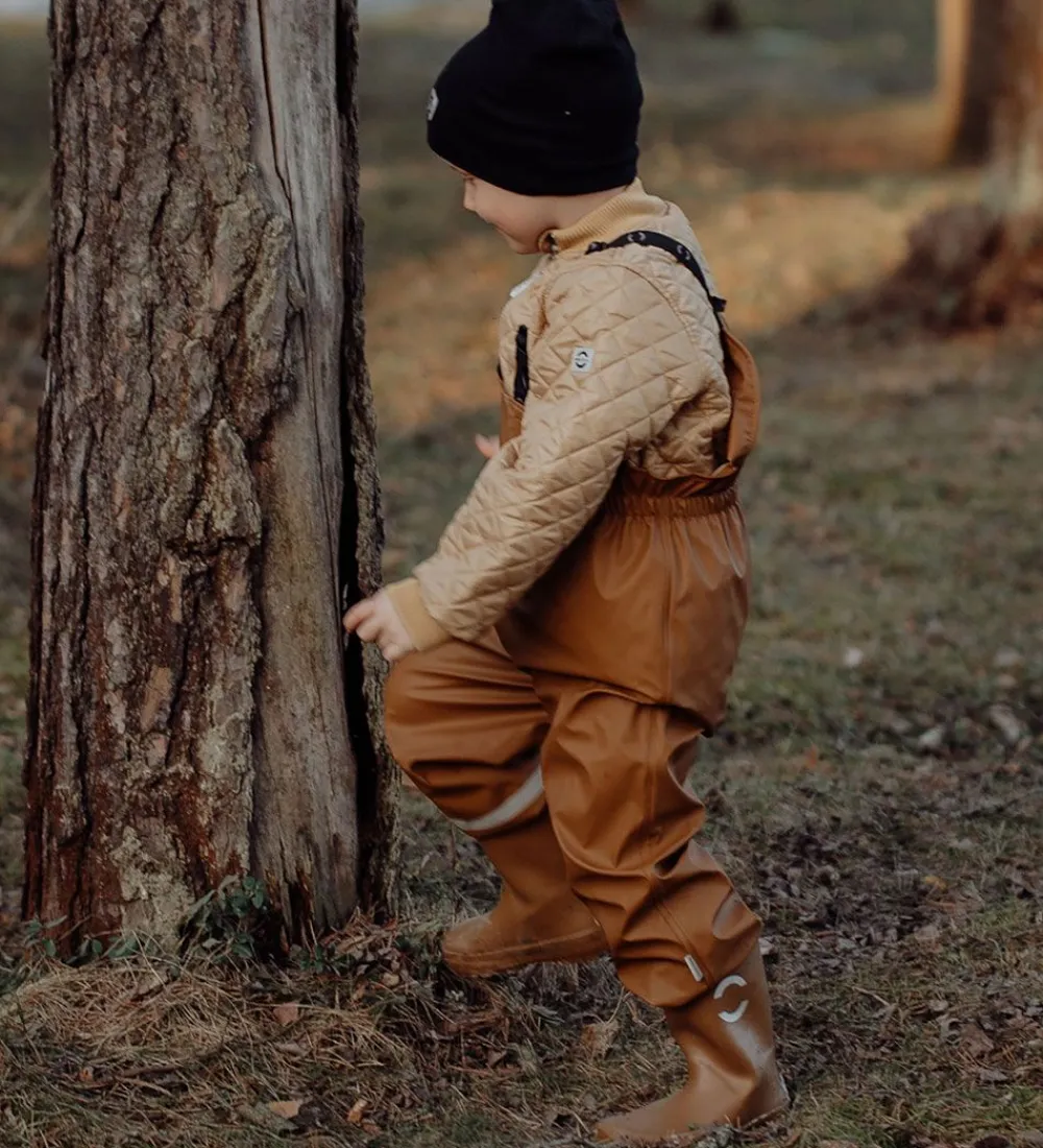 Flot Mikk-Line regntøj bestående af en regnjakke og et par regnbukser i ensfarvet, brun PU.