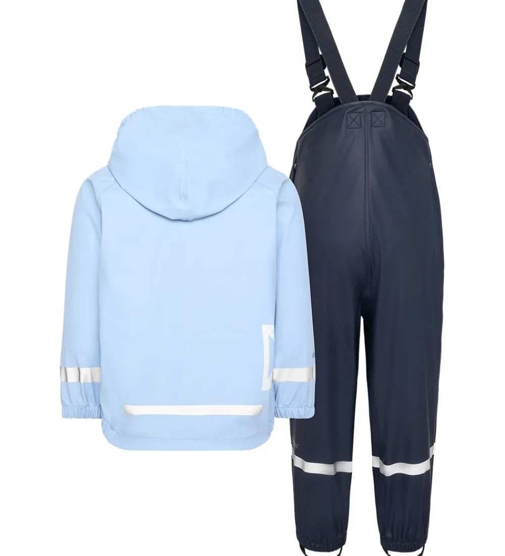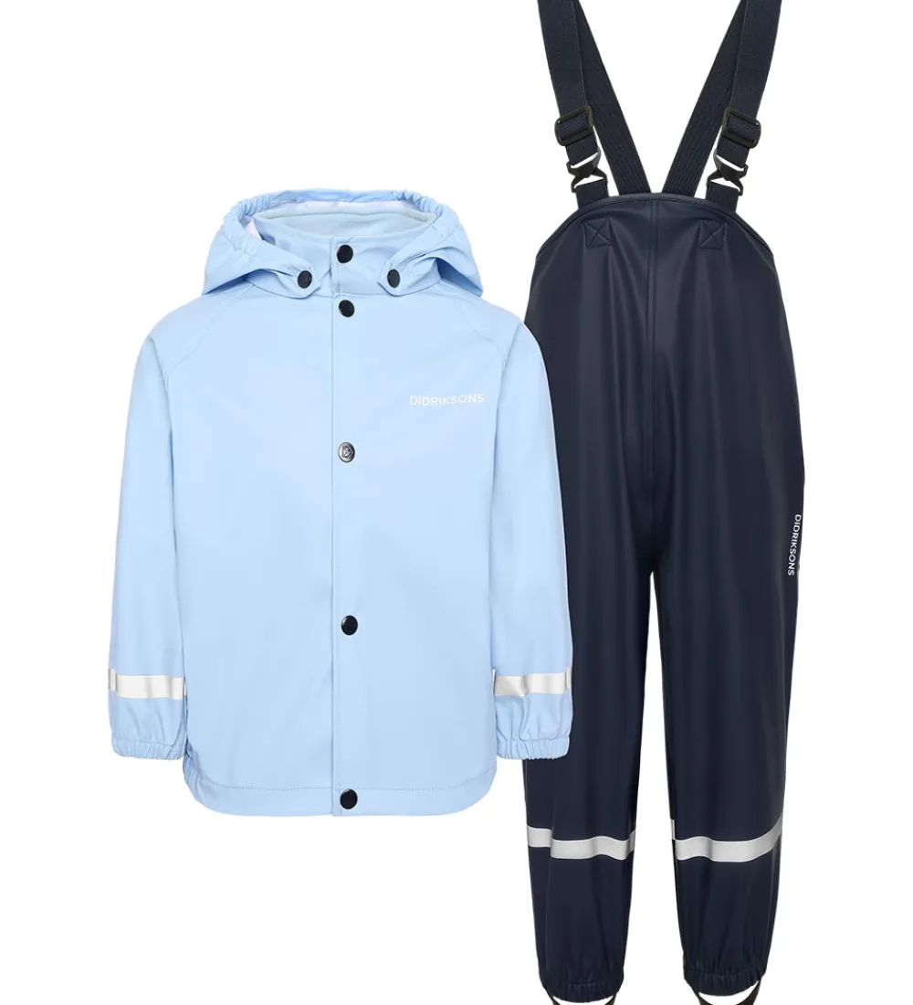 Lækkert Didriksons regntøj, der består af en regnjakke og et par regnbukser i to forskellige nuancer af blå. Regntøjet er lavet af PU.