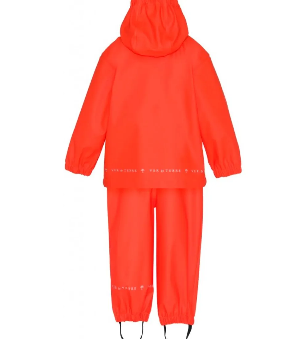 Smart Ver de Terre regntøj i en neonorange. Sættet består af en regnjakke og et par regnbukser med seler.