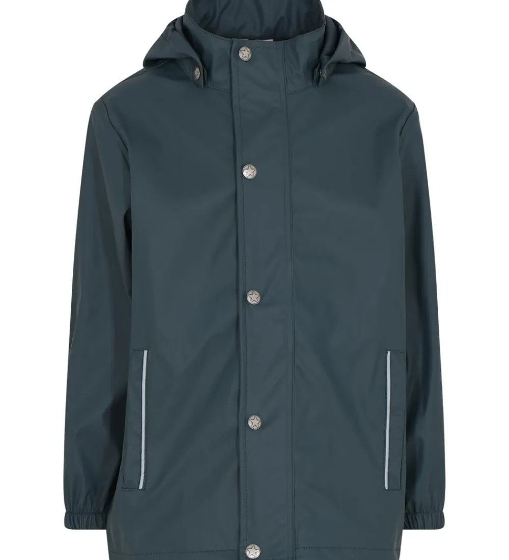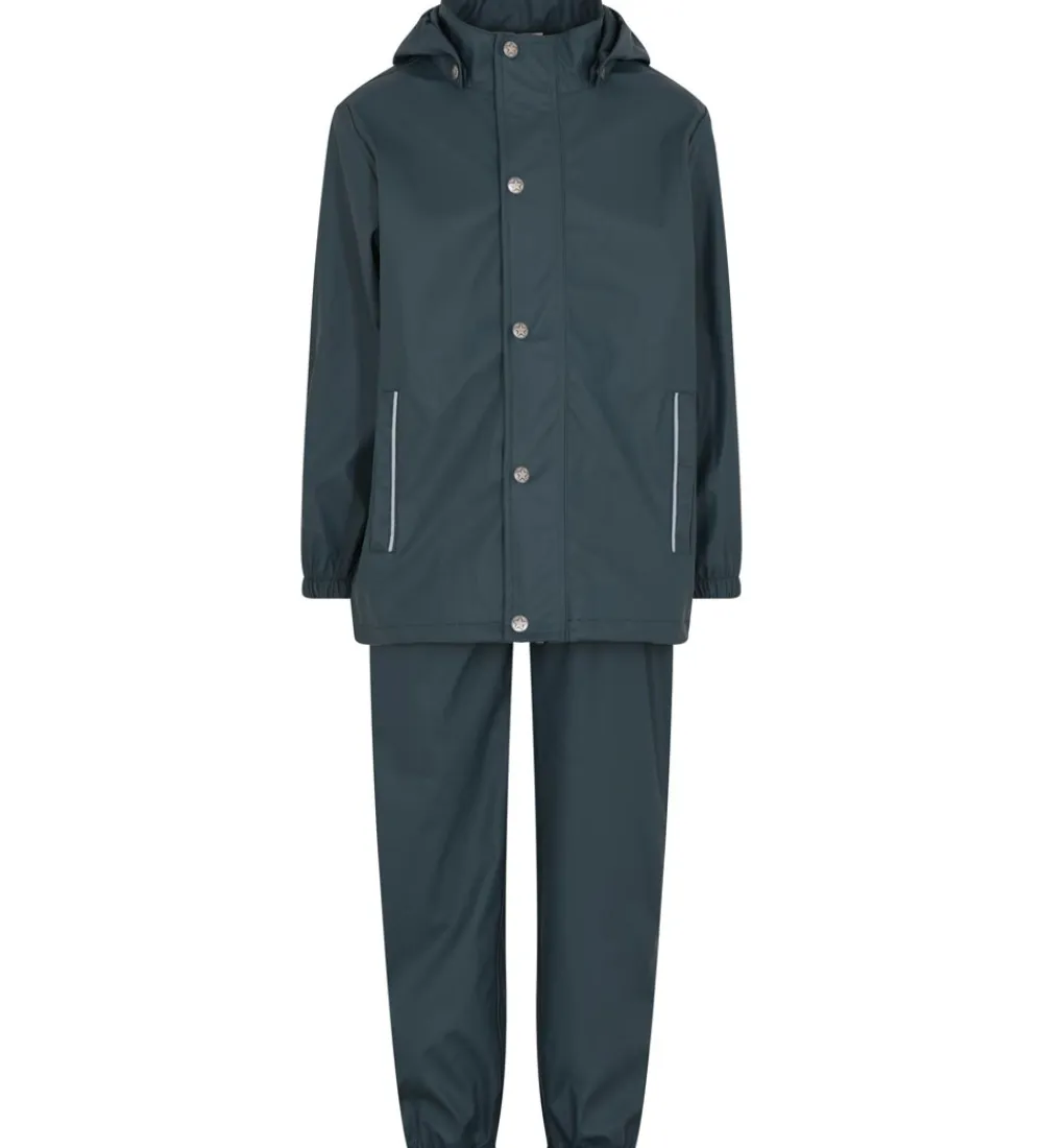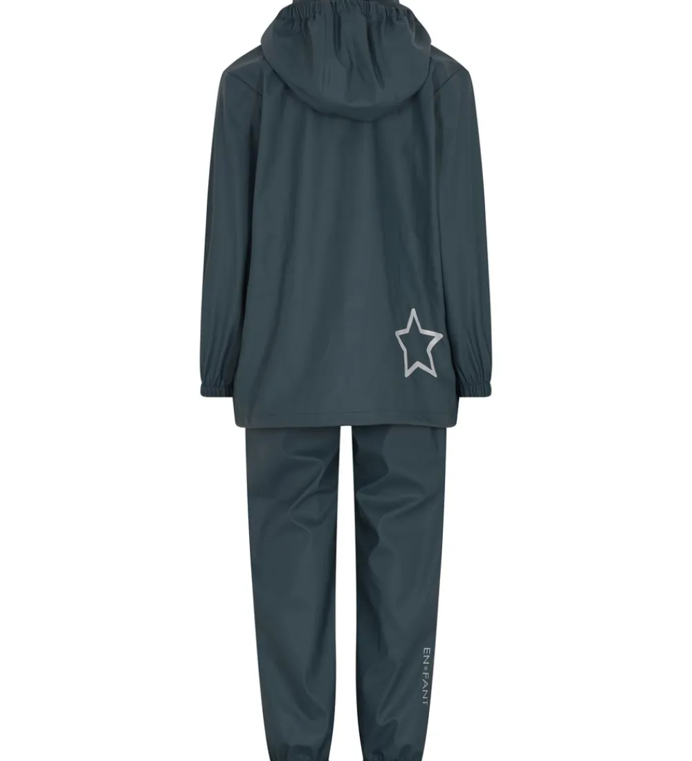 Lækkert En Fant regntøj i PU i støvet blå med sølvfarvede knapper. Regnsættet består af en regnjakke og et par regnbukser.