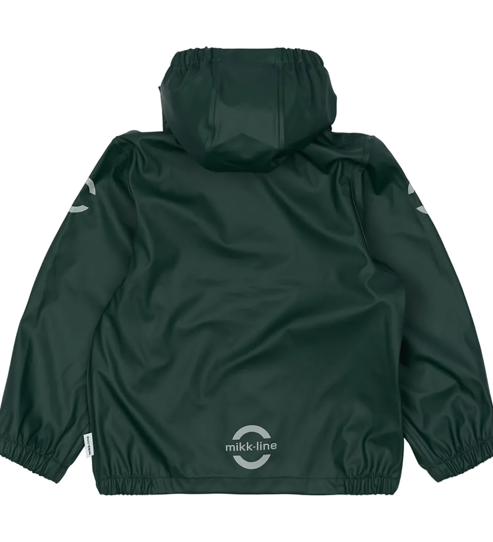 Fint Mikk-Line regntøj bestående af et par regnbukser og en regnjakke i ensfarvet mørkegrøn samt med velplacerede refleksdetaljer og -logoer.