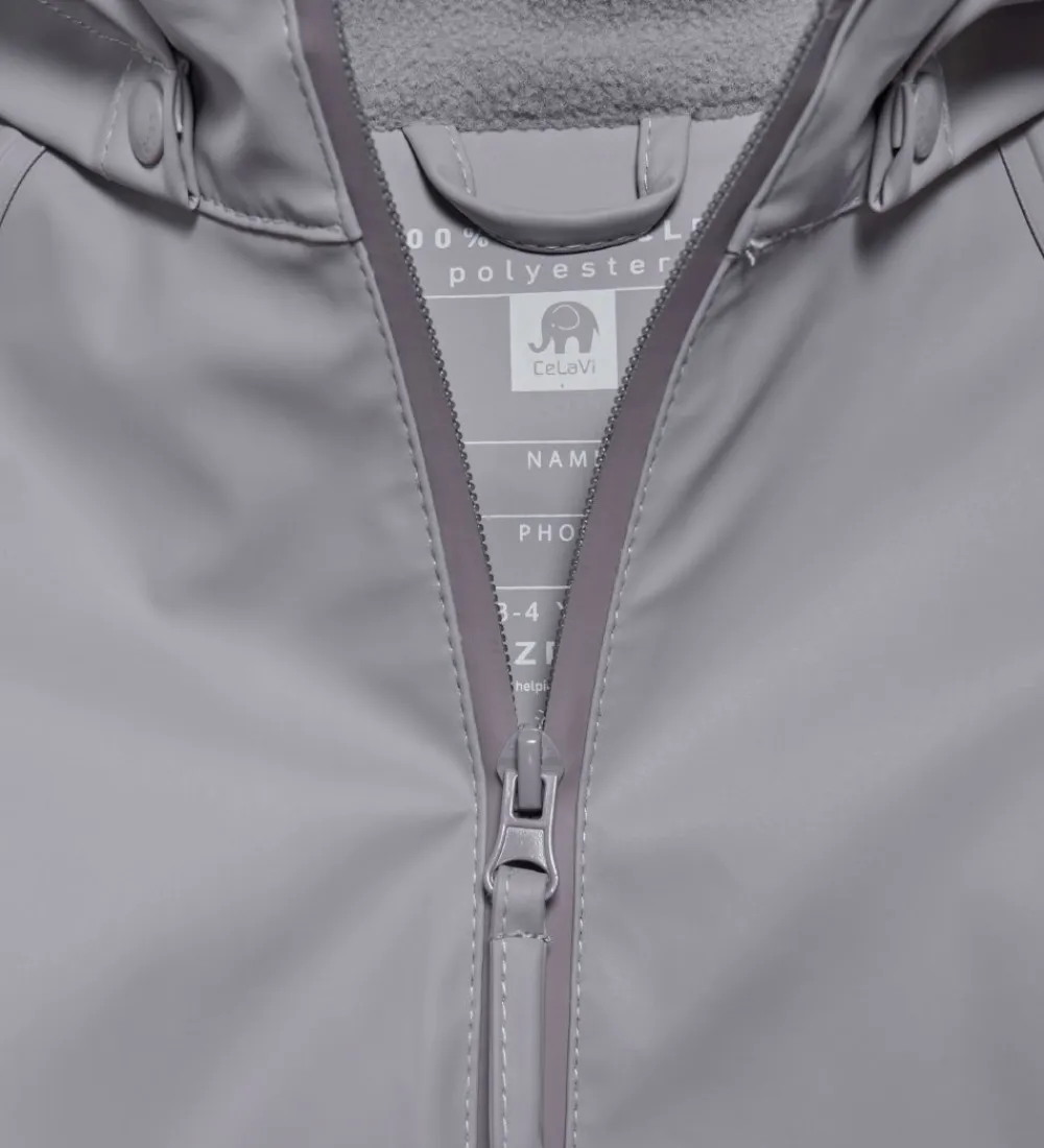 CeLaVi regnjakken har en aftagelig hætte, som sidder fast med trykknapper omkring den høje, fleeceforede halskrave. Hætten er med elastikkant i ansigtsåbningen. Ærmerne har elastikkanter, og i livåbningen er der elastik i siderne. Regnjakken åbnes fortil ved hjælp af en lynlås med en udvendig vindstolpe, der lukkes til med trykknapper.