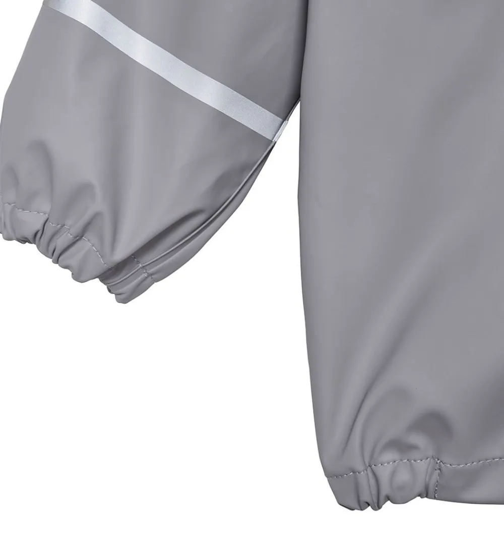 Regntøjet har smalle refleksstriber omkring højre ærme og højre bukseben.