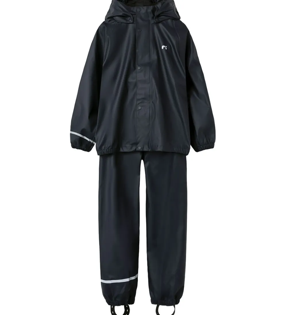 Flot Name It regntøj af PU bestående af en regnjakke og et par regnbukser i navyblå med et lille reflekslogo på venstre bryst og nederst på ryggen.
