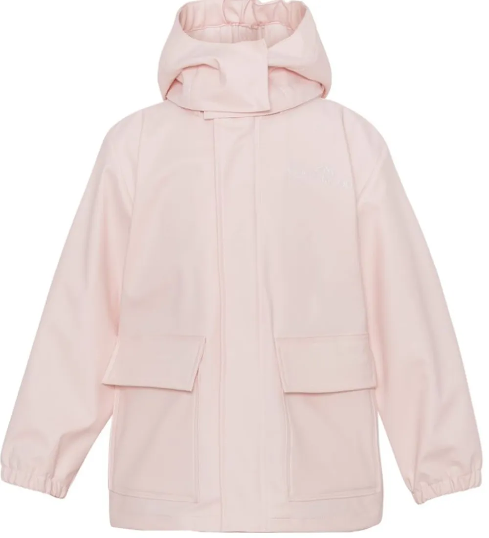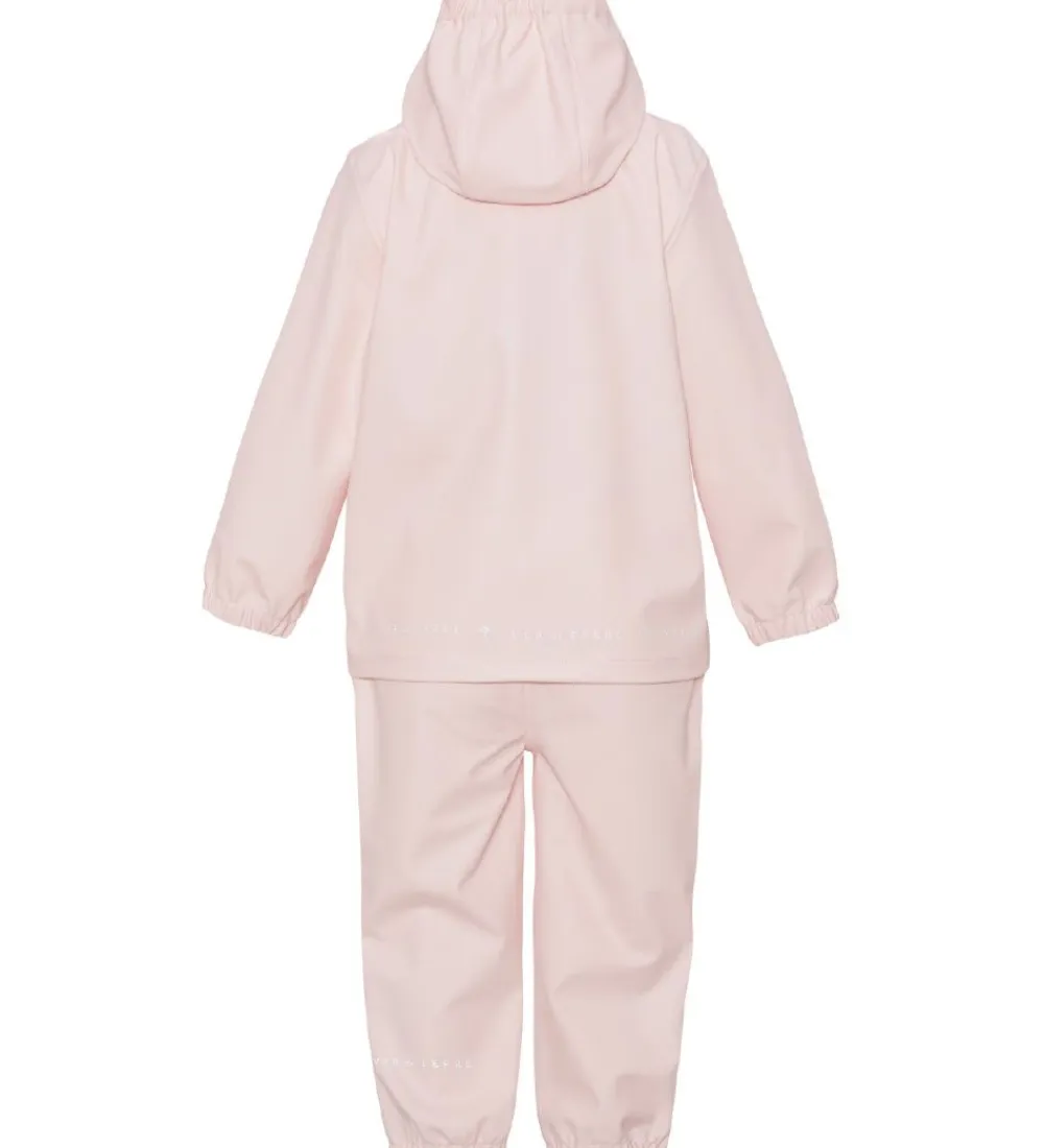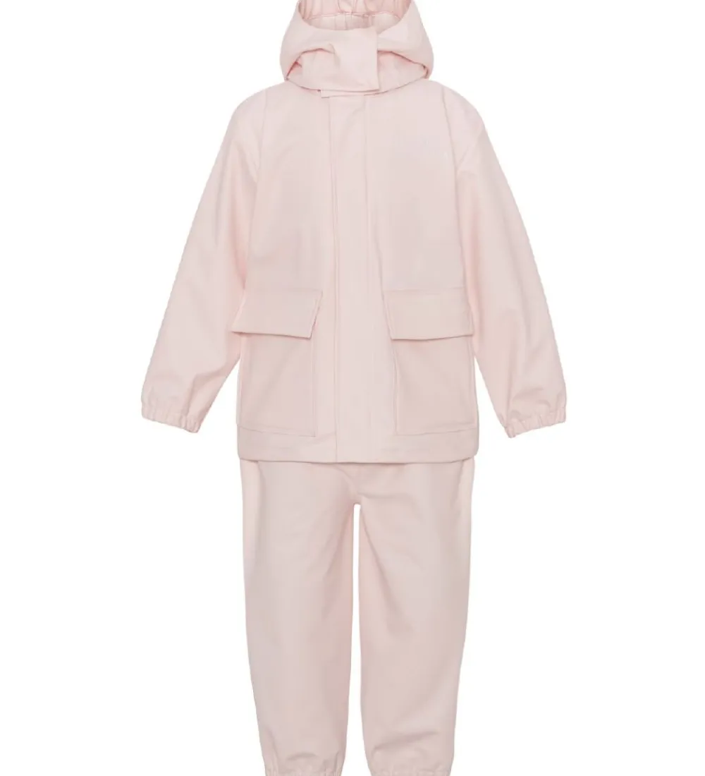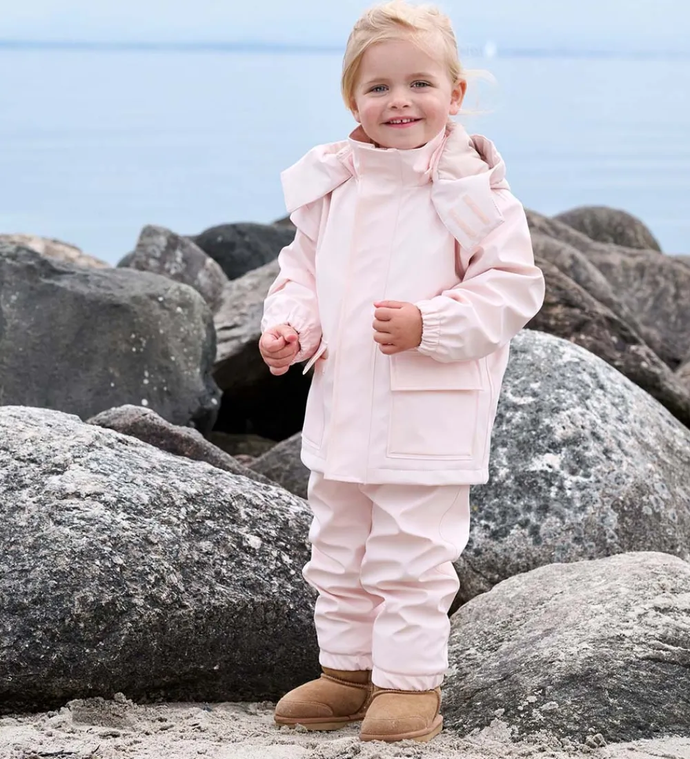 Flot Ver de Terre regntøj bestående af en regnjakke og et par regnbukser i ensfarvet pudderrosa.