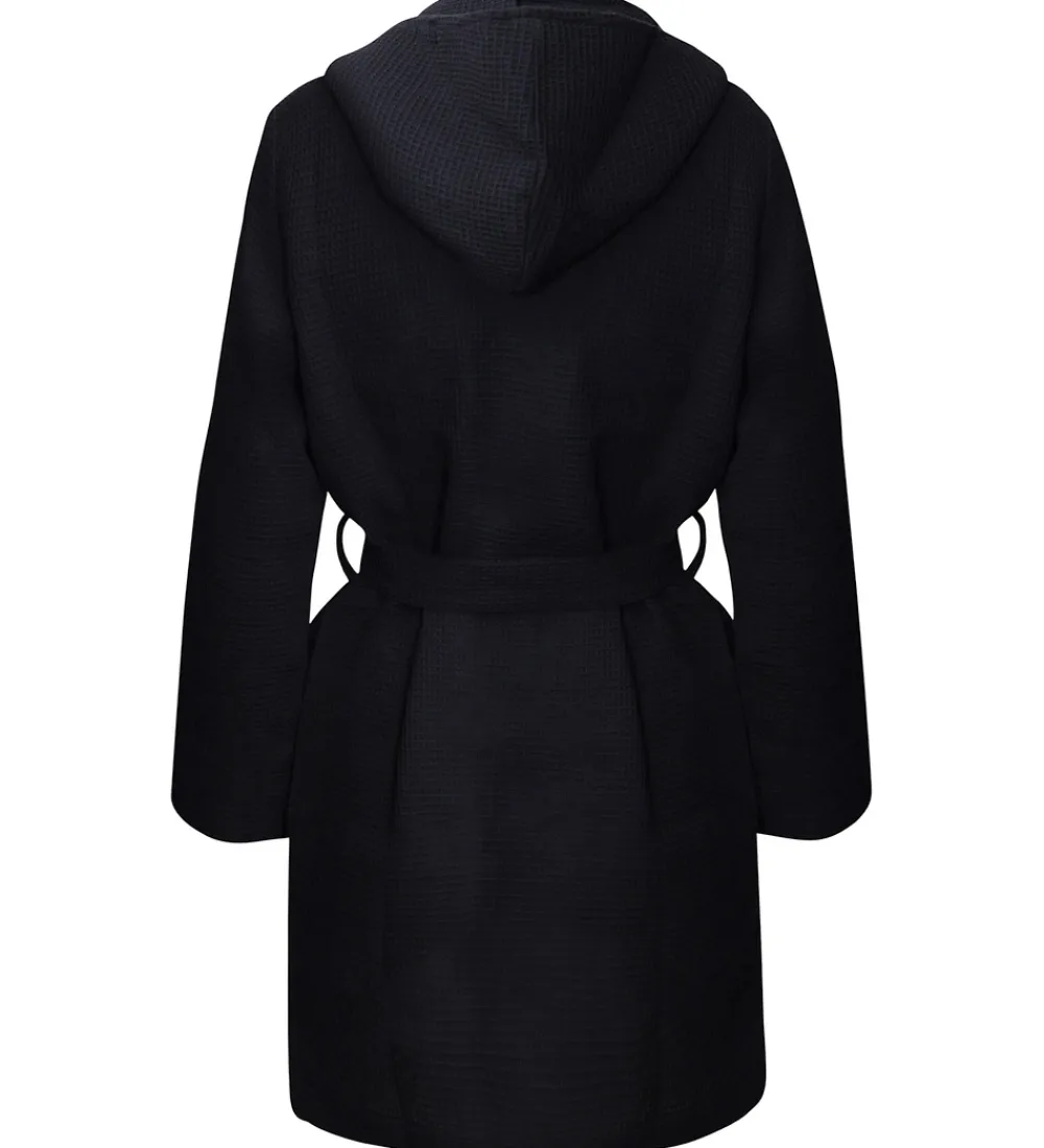 Flot Ronaldo badekåbe i ensfarvet sort bomuld med vaffelstruktur, og fortil i venstre side er står der “CR7” broderet i guld.