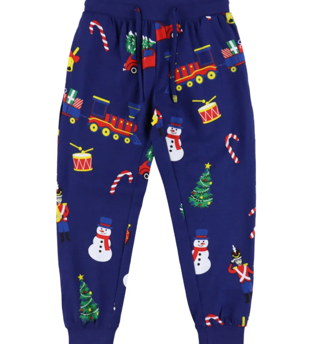 Fint Jule-Sweaters nattøj i mørkeblå med et allover-juleprint. Nattøjet består af en bluse med en rund halsudskæring og lange ærmer. Den har en smal ribkant i halsen og brede ribkanter i ærmerne. Natbukserne har en bred elastik i taljen, og kan justeres med snører fortil. I benåbningerne er der brede ribkanter.