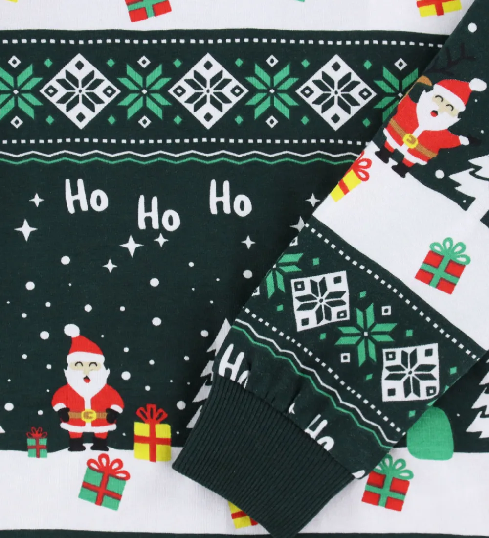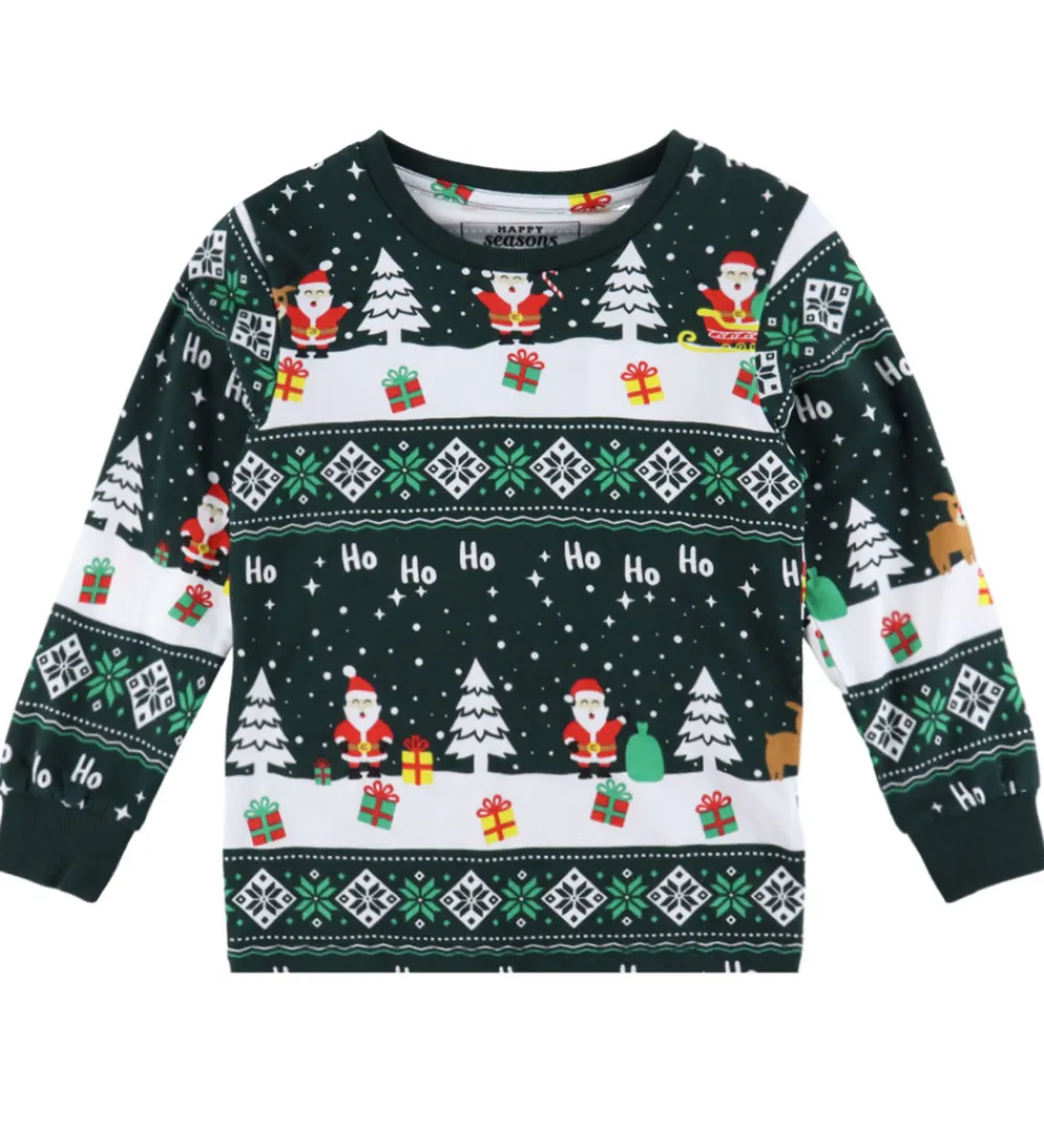 Festligt Jule-Sweaters nattøj i mørkegrøn med et allover-juleprint. Nattøjet består af en bluse med en rund halsudskæring og lange ærmer. Den har en smal ribkant i halsen og brede ribkanter i ærmerne. Natbukserne har en bred elastik i taljen, og kan justeres med snører fortil. I benåbningerne er der brede ribkanter.