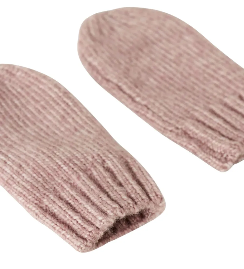 Lækkert Name It sæt bestående af en en hue samt et par luffer i meleret, rosa strik.