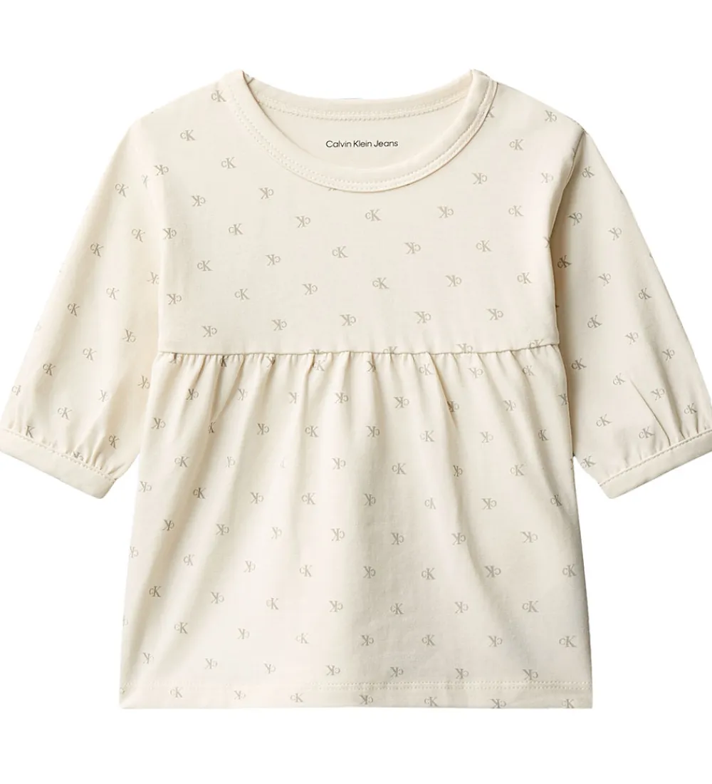Elegant Calvin Klein sæt bestående af en kjole og et par bloomers. Sættet er i en sart beige nuance med et delikat all-over mønster af små CK-logoer. Calvin Klein kjolen har lange ærmer og en rund halsudskæring. Bloomersene har smalle bred elastikkant som giver en god pasform.