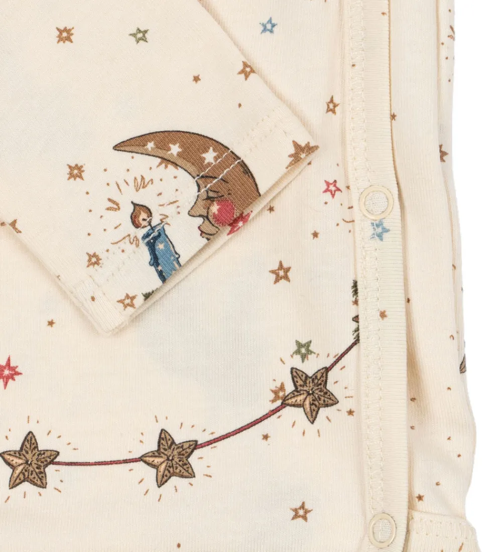 Indbydende Konges Sløjd sæt bestående af en slå-om body og et par leggings. Sættet er i beige med et charmerende motiv af måner og stjerner.