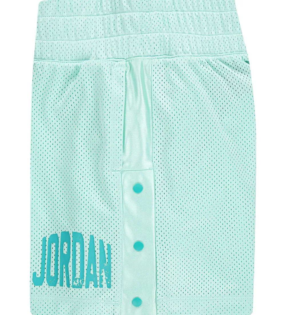 Smarte Jordan shorts i en lækker mintgrøn meshkvalitet i to lag og med et grønt jumpman-logo broderet på højre ben og et grønt “Jordan” print på venstre ben. Jordan shortsene har bukseben med høje slidser i hver side, med grønnee trykknapper. Shortsene fra Jordan har desuden åbne forlommer og en bred, elastisk talje med en firkantet brand- og logoapplikation fortil.