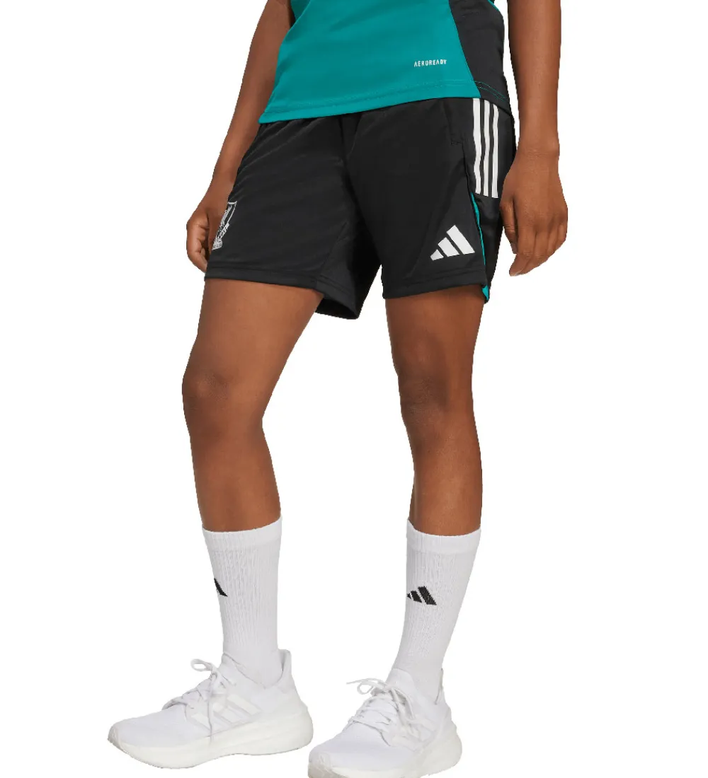 Smarte adidas Performance shorts i sort med hvide og grønne detaljer, og nederst på højre bukseben sidder der et logo for den engelske foboldklub Liverpool FC. Shortsene er inspireret af holdets ungdomshold i sæsonen 25/26.