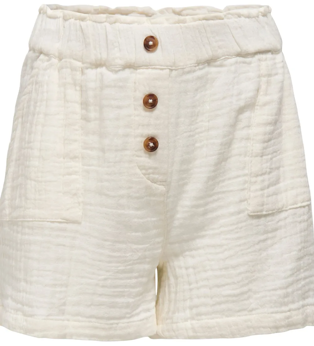 Komfortable Kids Only shorts i en stilren, hvid nuance med musselin struktur. Shortsene har praktiske lommer og dekorative knapper foran, der giver et enkelt og tidløst look. Kids Only sikrer høj kvalitet og god pasform.