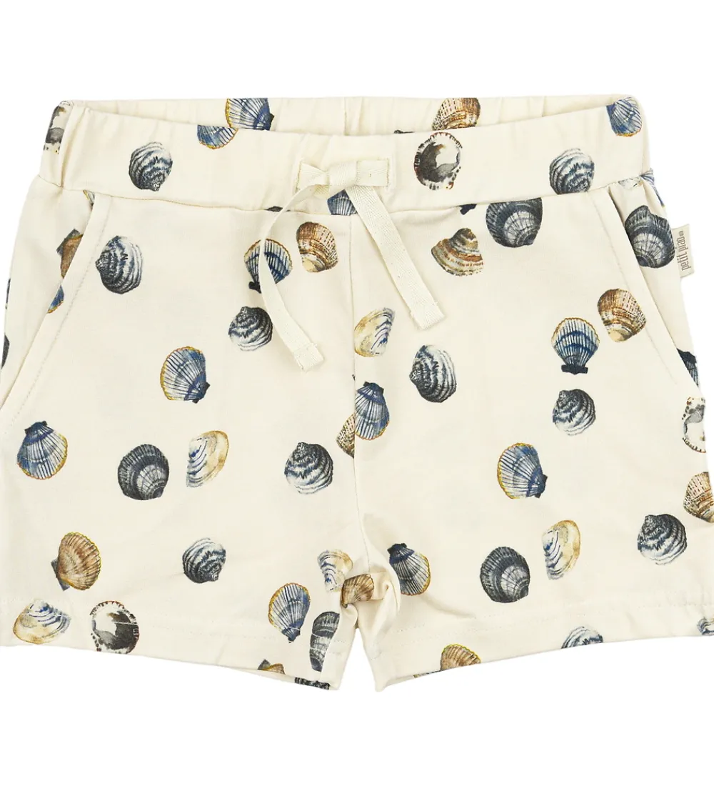 Flotte Petit Piao shorts i beige med et stilfuldt muslingemønster i nuancer af blå, brun og sand. Petit Piao shortsene har en elastisk talje med justerbart bindebånd og praktiske lommer i siderne.