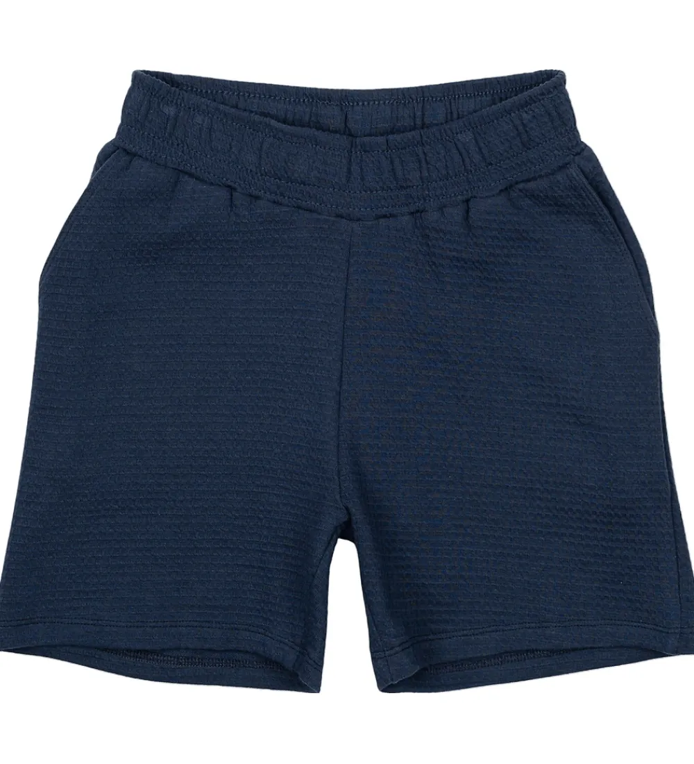 Smarte The New shorts i ensfarvet navyblå med vaflet struktur. The New shortsene har en elastisk talje, som kan justeres med knapper indvendigt. I siderne er der praktiske lommer og bagtil er der en firkantet lomme i højre side.