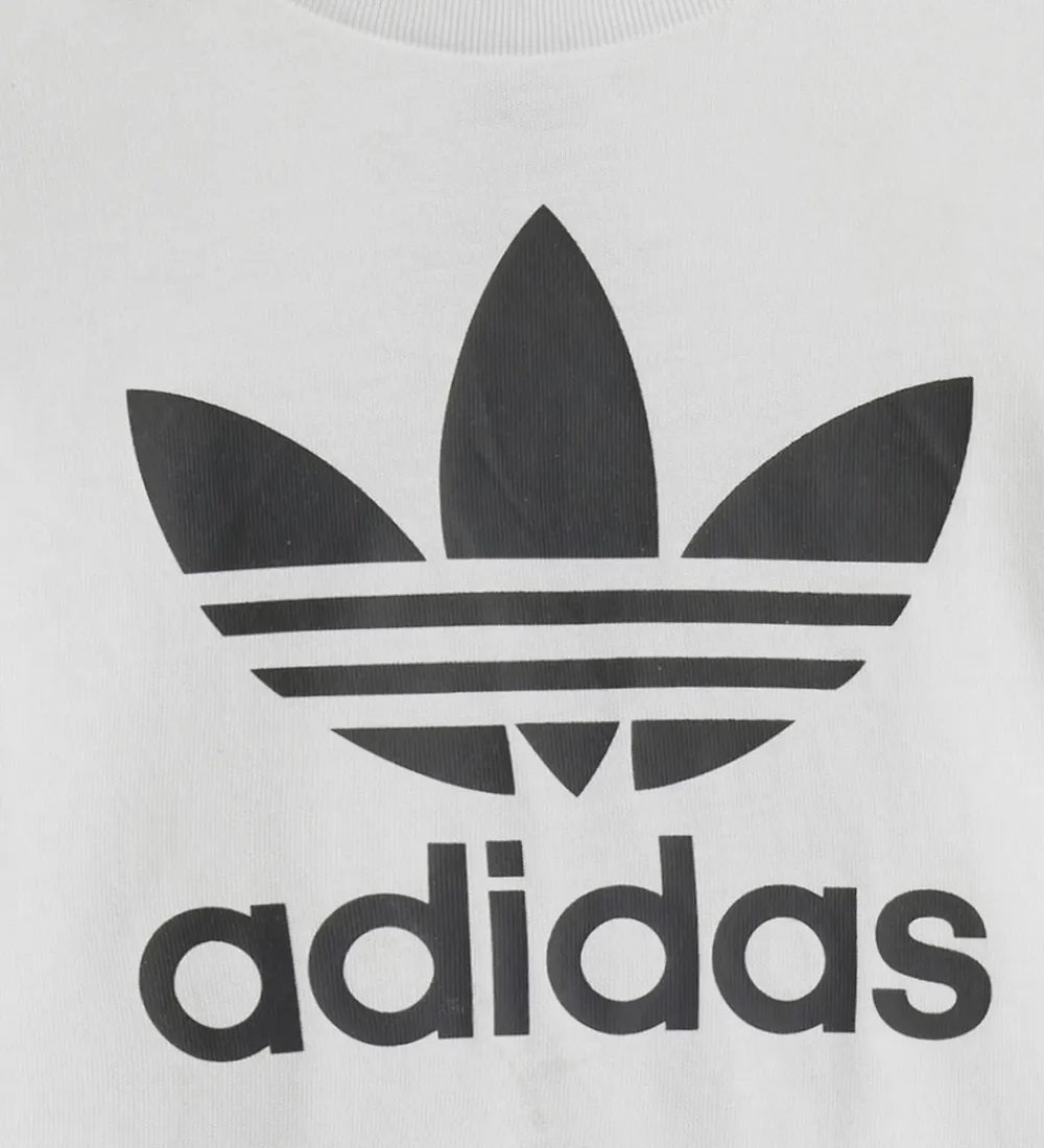 Smart adidas Originals shortssæt bestående af en hvid t-shirt med et stort, sort logoprint på fronten og et par sorte shorts med hvide striber langs siderne og et hvidt adidas-logo broderet på venstre ben.