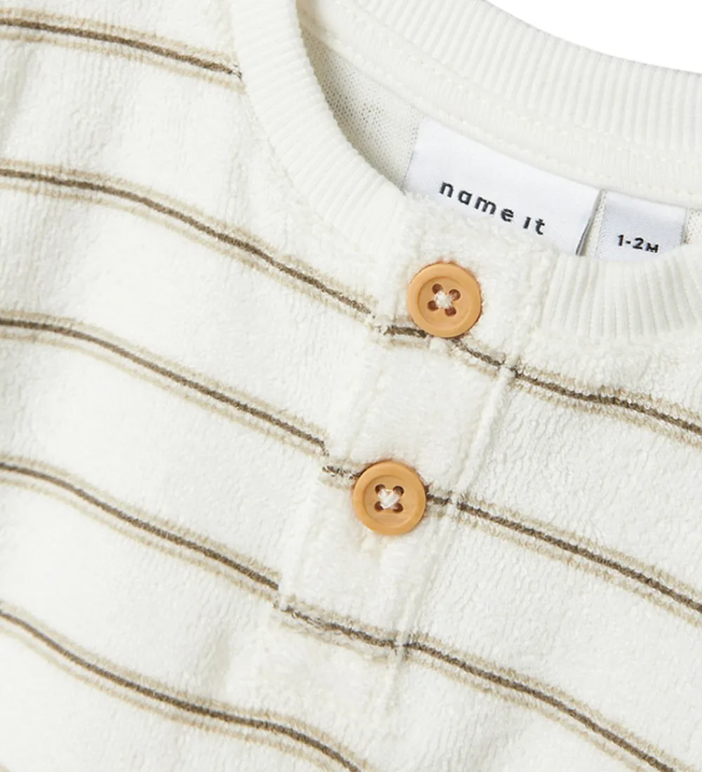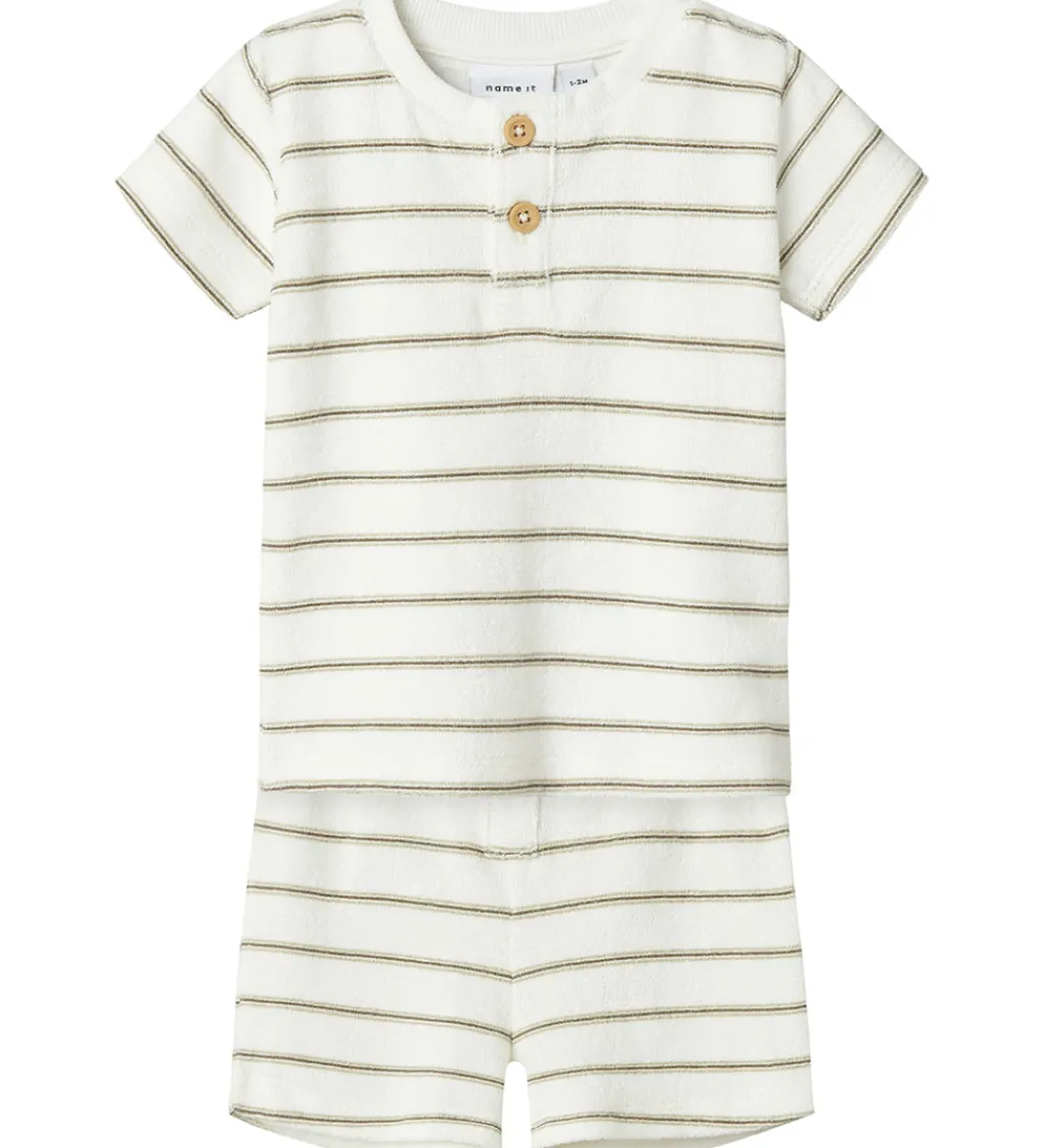 Charmerende Name It shortssæt i hvid med flotte vandrette striber i brun og beige. Sættet består af en t-shirt og et par shorts med en blød og frotte overflade.