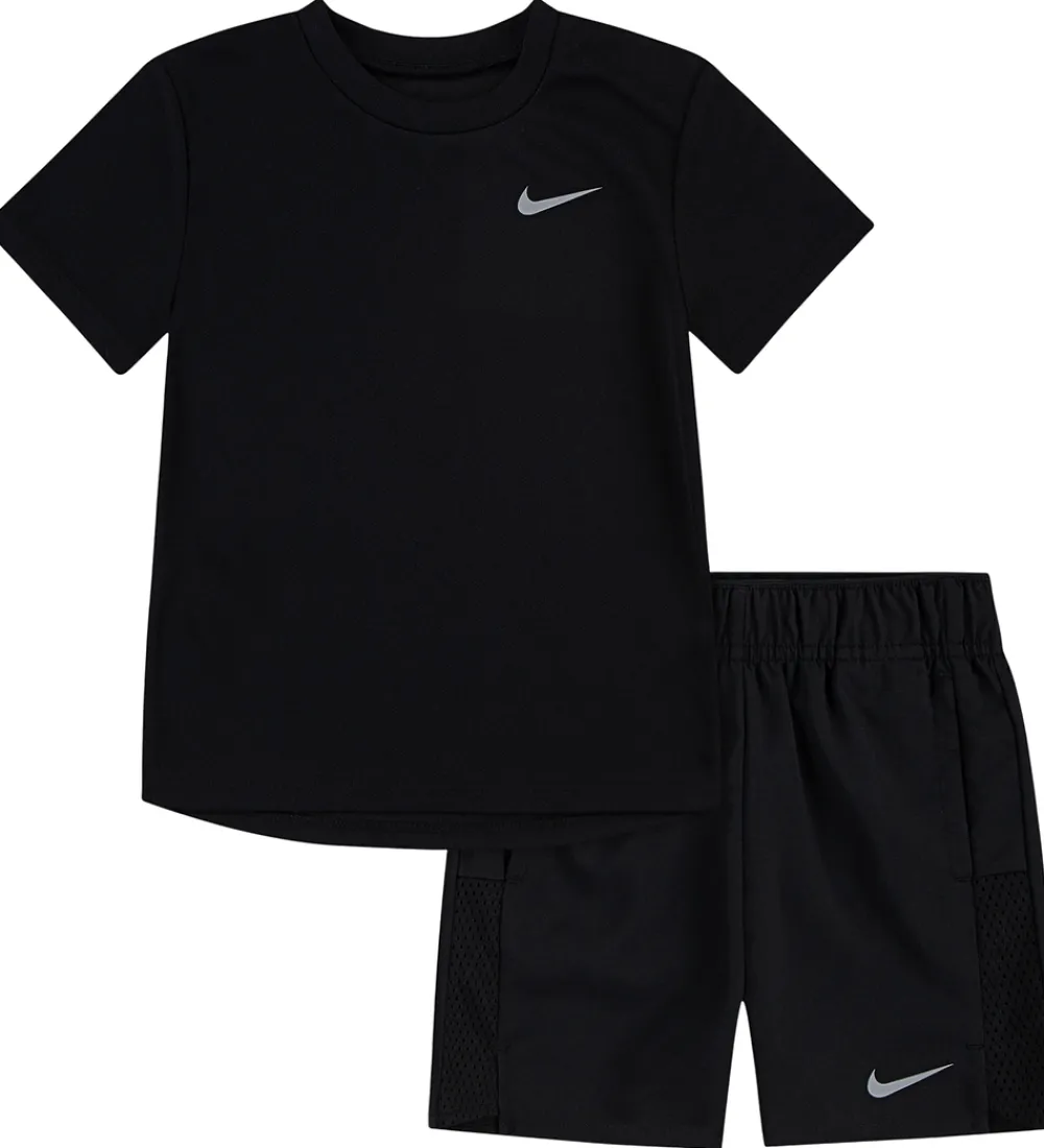 Lækkert Nike sæt, der består af et par shorts og en t-shirt i sort med et lille refleksprint formet som et logo.