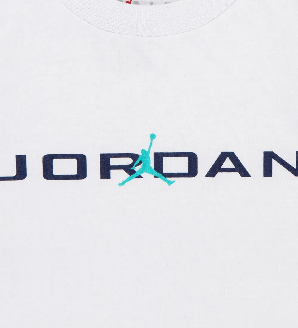 Smart shortssæt fra Jordan bestående af en t-shirt og et par shorts. T-shirten er hvid med et flot brand-og jumpmanprint henover brystet i henholdsvis sort og grøn. På venstre ærme er der et tilsvarende jumpman print.