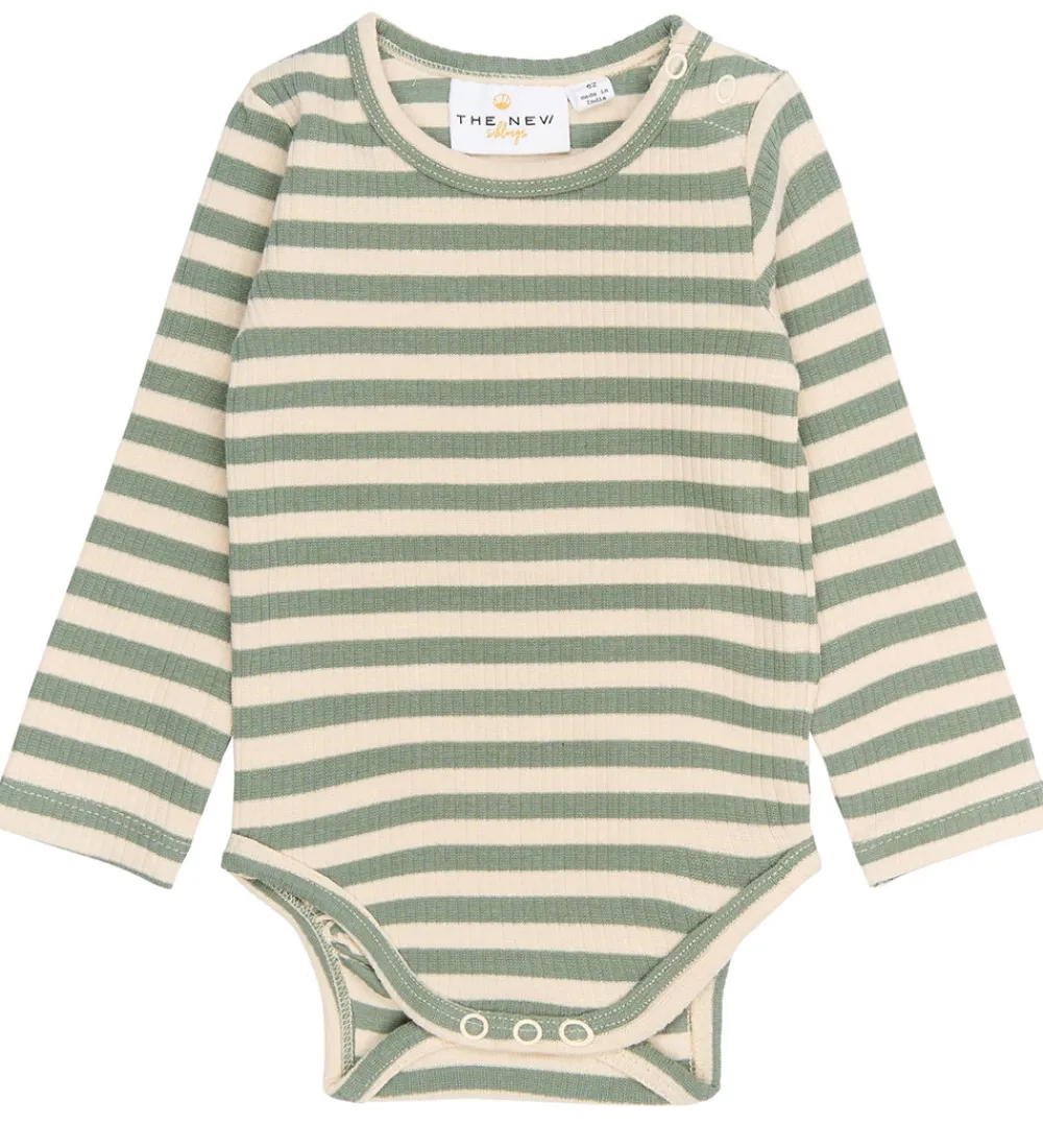 Elegant The New Siblings body med lange ærmer i et stilet grøn- og hvidstribet design. The New Siblings bodyen har en blød ribstruktur, som bidrager til en behagelig pasform.
