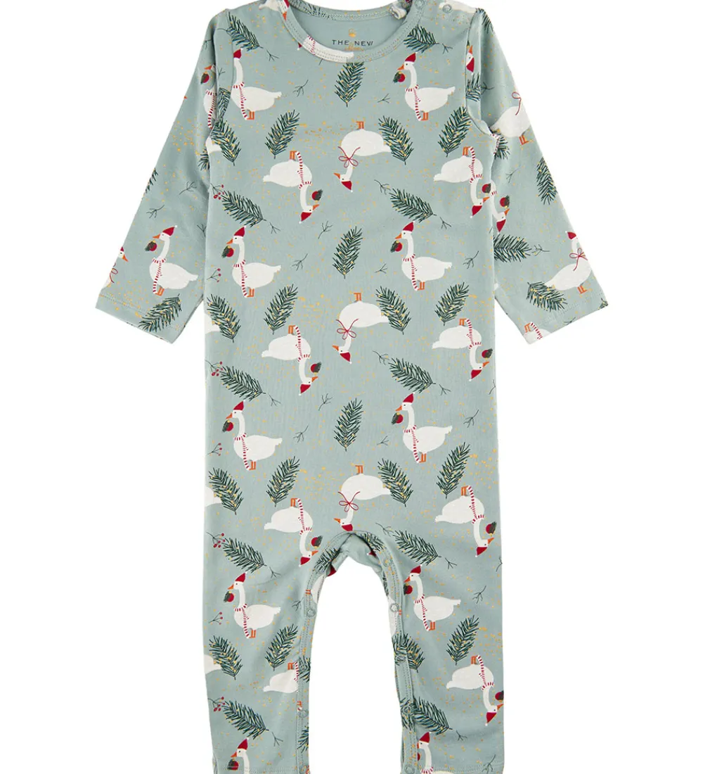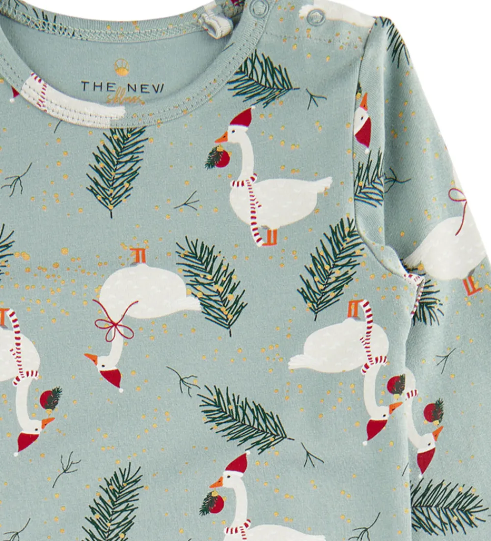 Skøn The New Siblings heldragt i lys turkis med hvide gæs med en rød nisshue på og et tørklæder og gavebånd om halsen sammen med mørkegrønne grangrene og guldfarvede prikker.