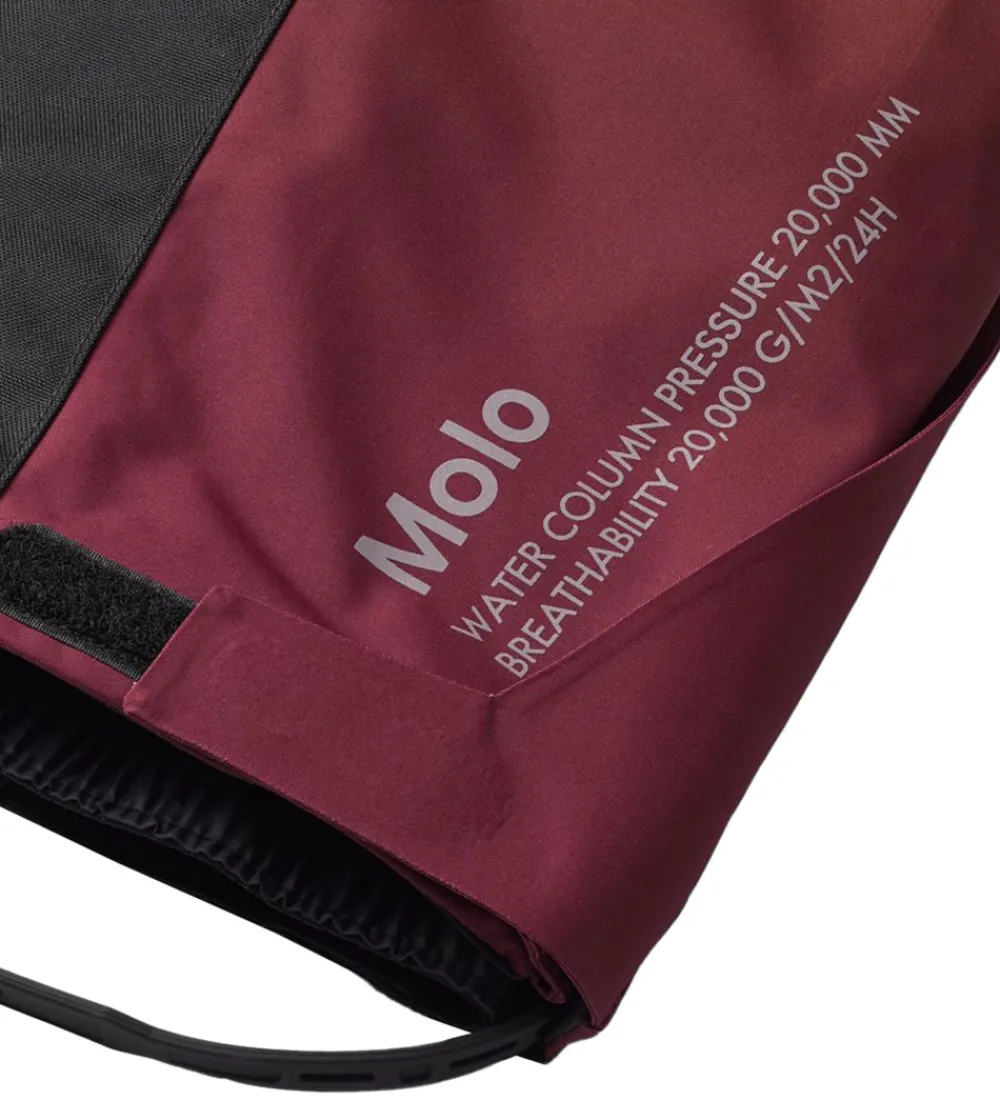 Molo skibukserne udvendige velcrojusteringer omkring livet og velcrostropper til fastgørelse af seler. Skibukserne åbnes fortil med trykknap og lynlås, og der er lynlåslommer i siderne. Buksebenene har snefang med elastikkanter og indvendig gummibelægning og kan knappes op med en trykknap.
