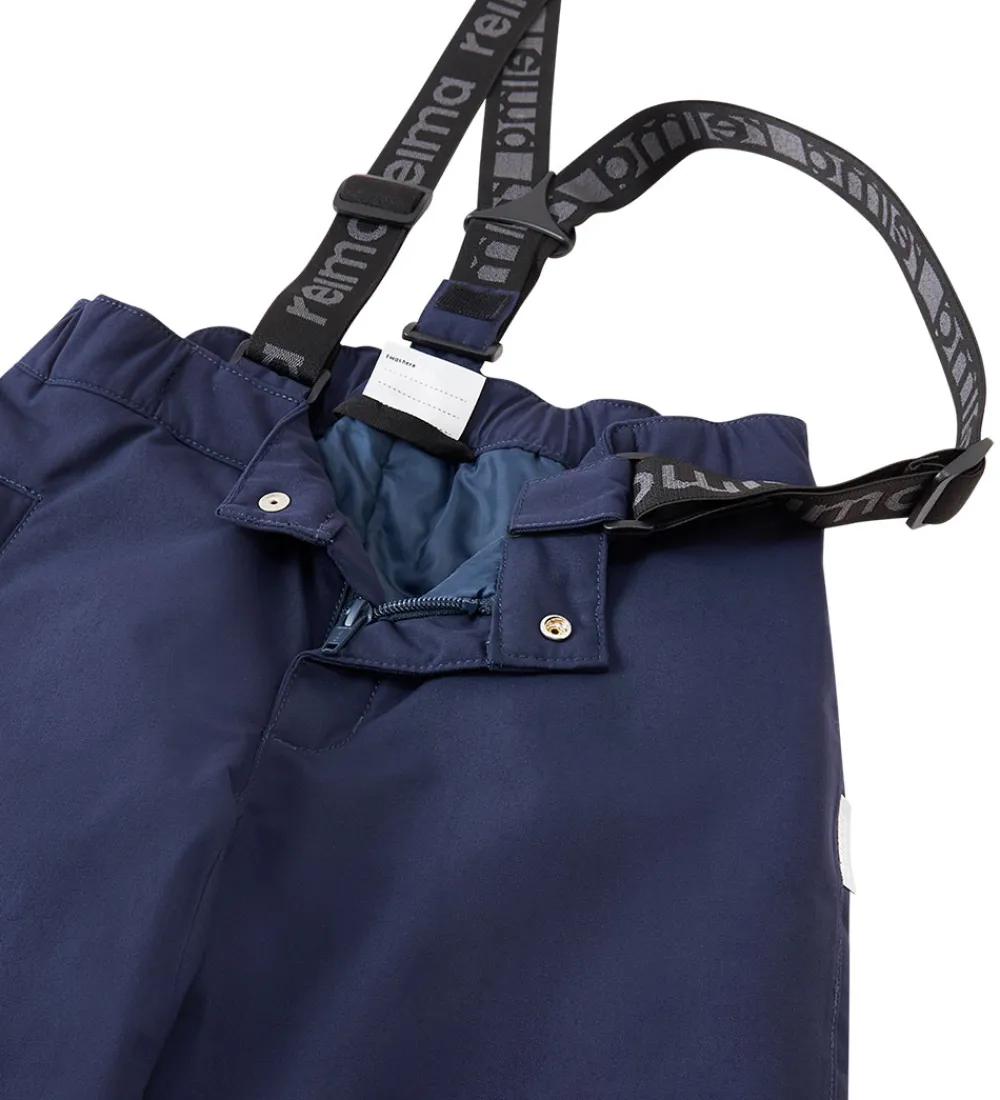 Reima skibukserne har justerbare, aftagelige seler, som fæstnes med velcro, og de samles på ryggen, så de sidder godt fast på skuldrene. I livet er der en indvendigt justerbar elastikkant, og skibukserne åbnes fortil med en tryknap og en lynlås. I siderne er der praktiske lommer, som lukkes med en skjult lynlås.