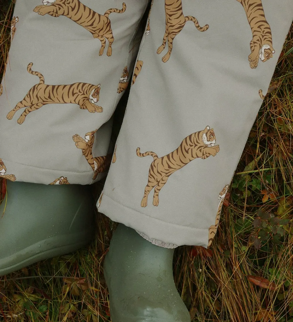 Praktiske Konges Sløjd skibukser i en støvet grøn og med et alloverprint af tigere i brune nuancer.