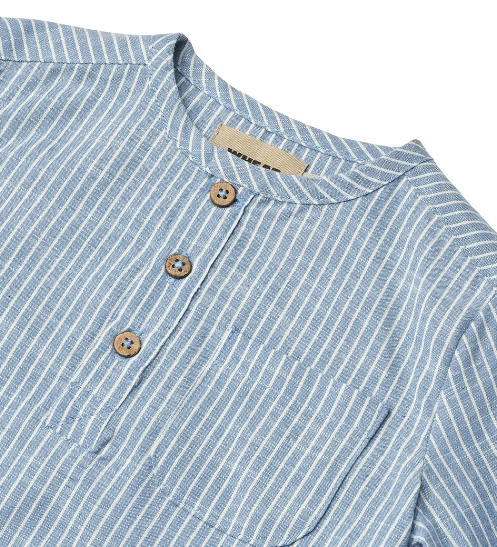 Fin Wheat skjorte i lyseblå med fine, hvide striber. Skjorten har knapdetaljer og en praktisk lomme på brystet, hvilket giver et let og stilrent look fra Wheat.