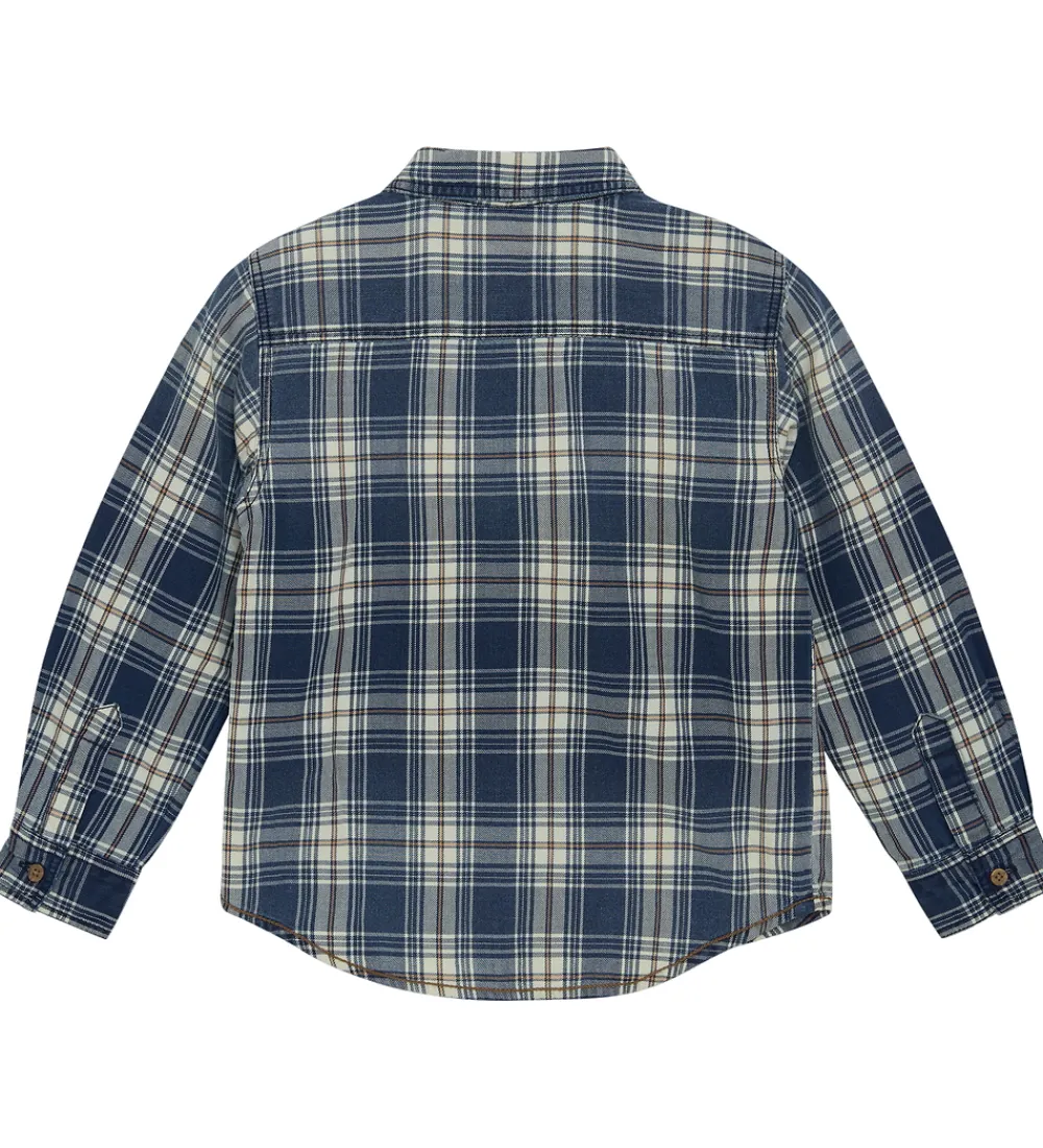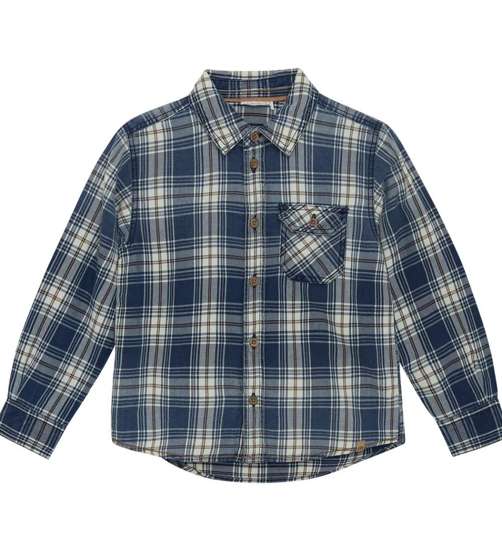 Stilren Minymo skjorte med ternet mønster i blå nuancer med orange detaljer. Skjorten har en klassisk krave og gennemgående, brune knapper fortil. Fortil er der en brystlomme, og skjorten har lange ærmer med manchetknapper.