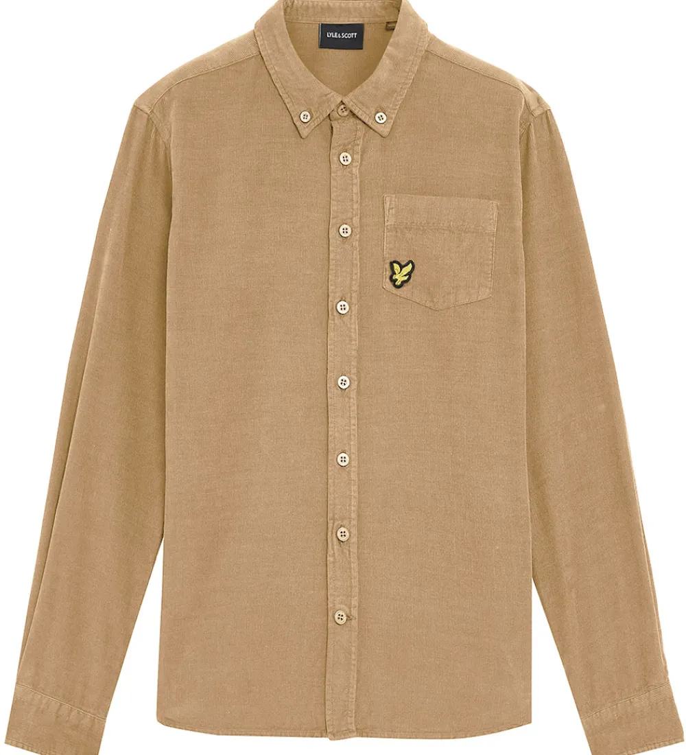Lækkert Lyle & Scott skjorte med lange ærmer i en sandfarvet nuance i fløjl med et karakteristisk logoprint på brystlommen. Skjorten er velegnet til både leg og hverdag.