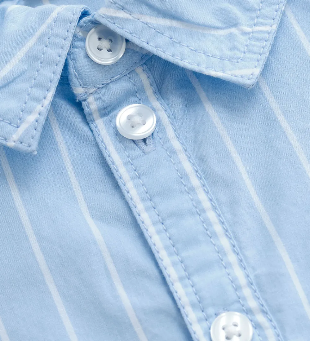 Stilfuld Minymo skjorte i lyseblå med smalle, hvide striber. Skjorten har en klassisk krave og en gennemgående knaplukning fortil. Den har lange ærmer med manchetknapper ved håndleddene, og nederst er der en flot runding.