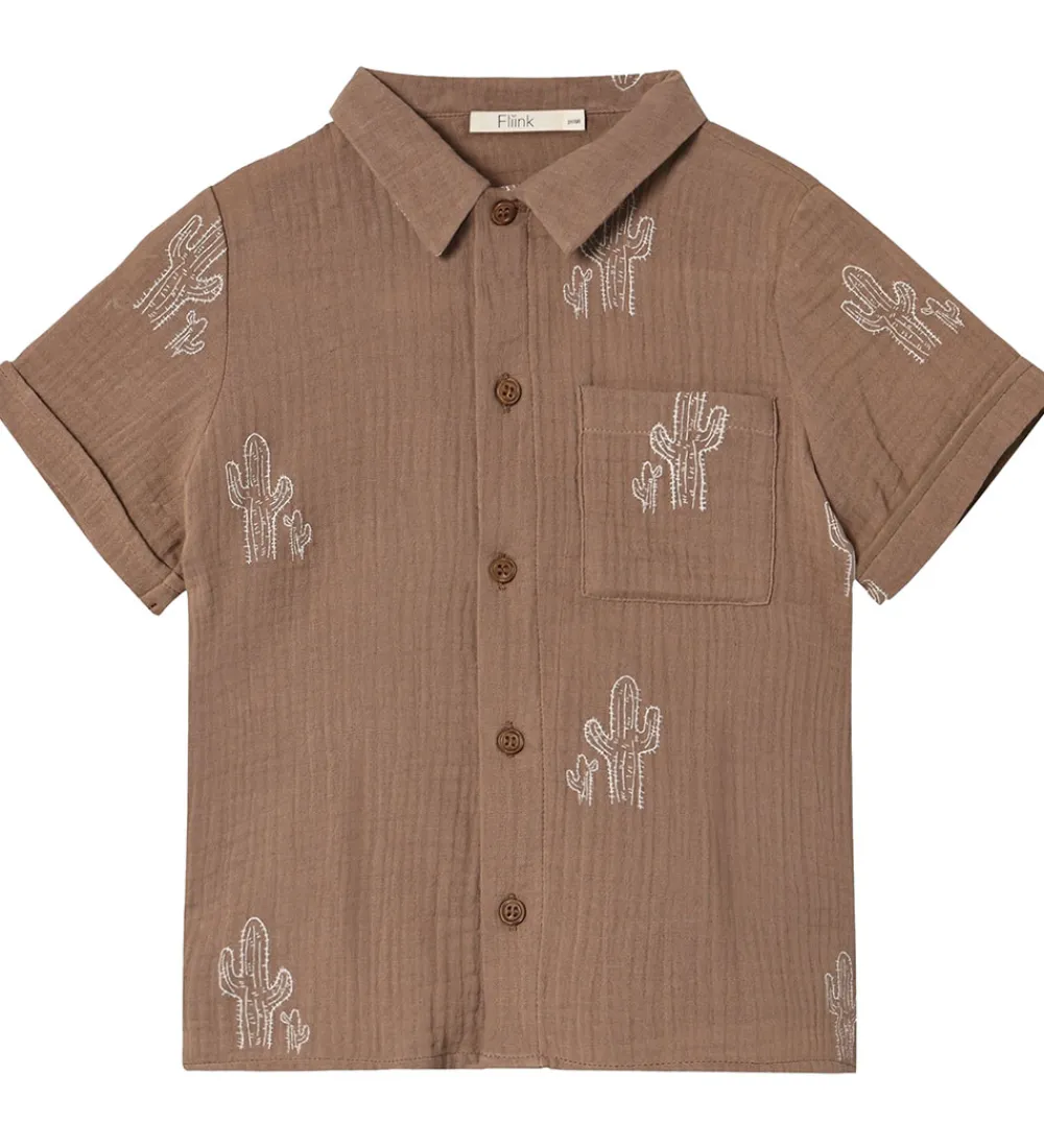 Elegant Fliink skjorte med korte ærmer i en brun farve med et kaktusprint i en lysere nuance. Fliink skjorten har klassisk krave og knaplukning foran samt en lille lomme på brystet.