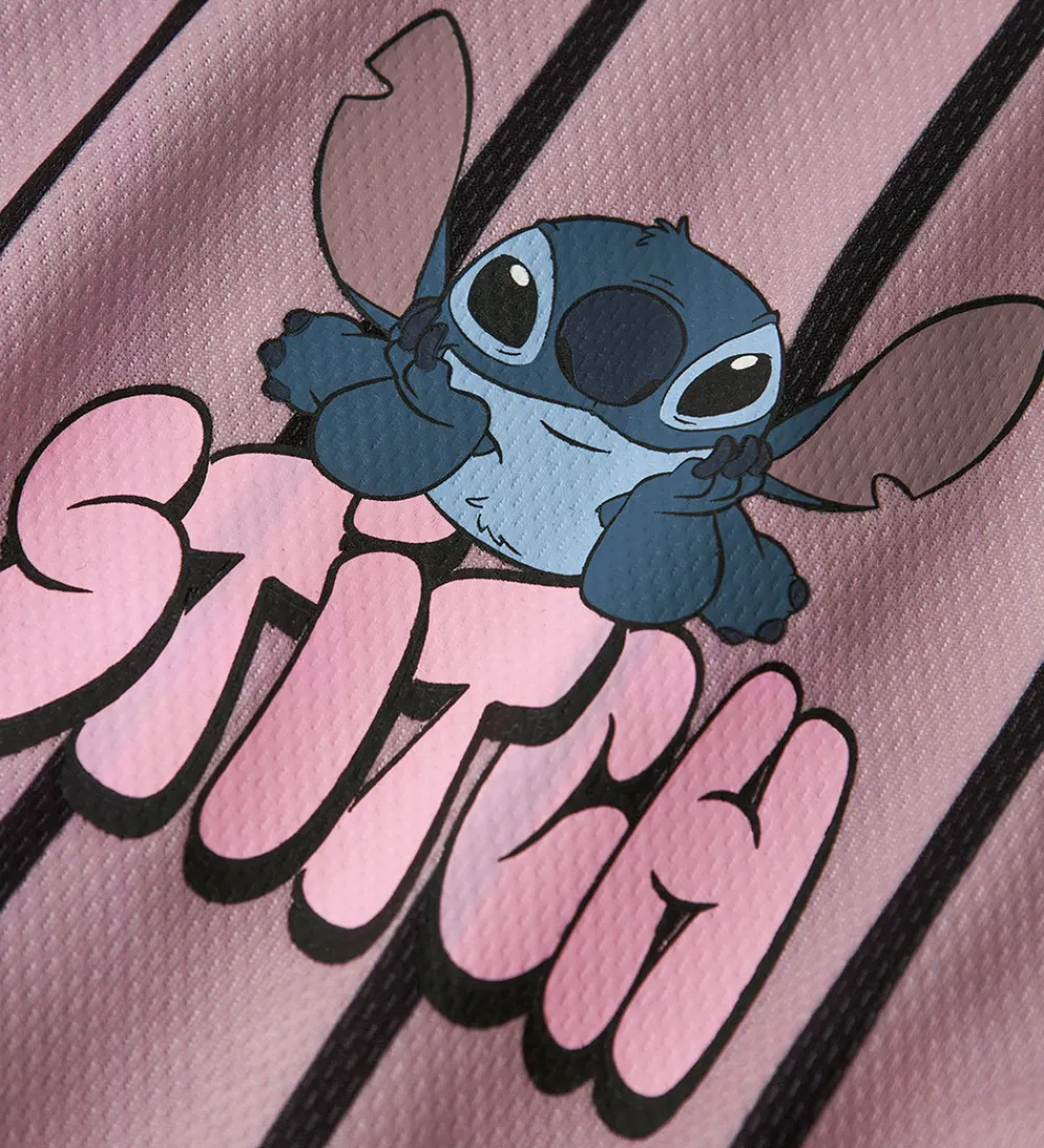 Stilfuld Name It skjorte med sporty design. Skjorten er rosa med sorte striber og et Stitch-print på venstre bryst og på ryggen. Den har korte ærmer og gennemgående knapper fortil.