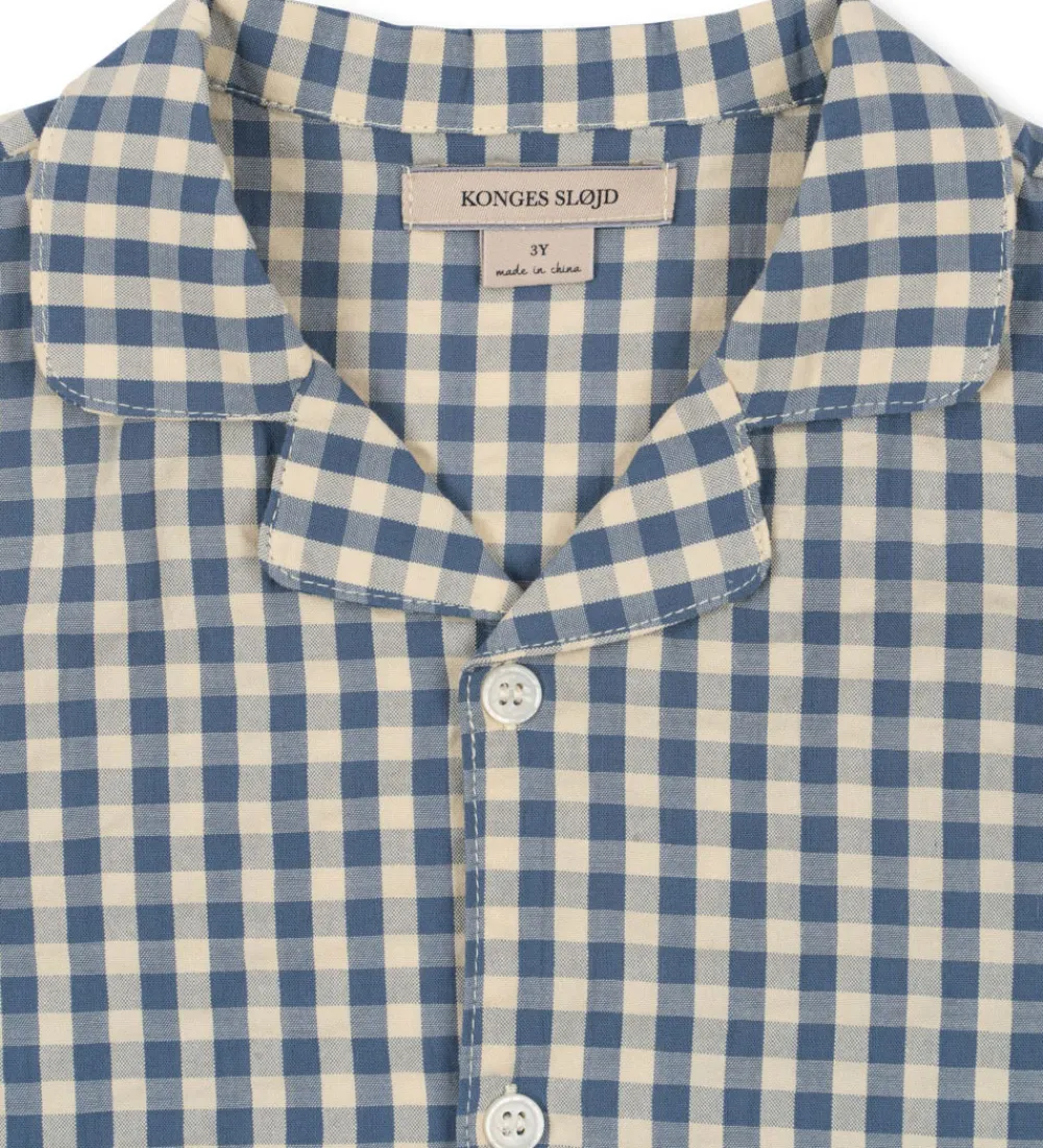 Lækker Konges Sløjd skjorte med korte ærmer i blå og cremehvid ternet design. Skjorten har en flot krave og knaplukning foran, hvilket giver et stilrent udtryk.