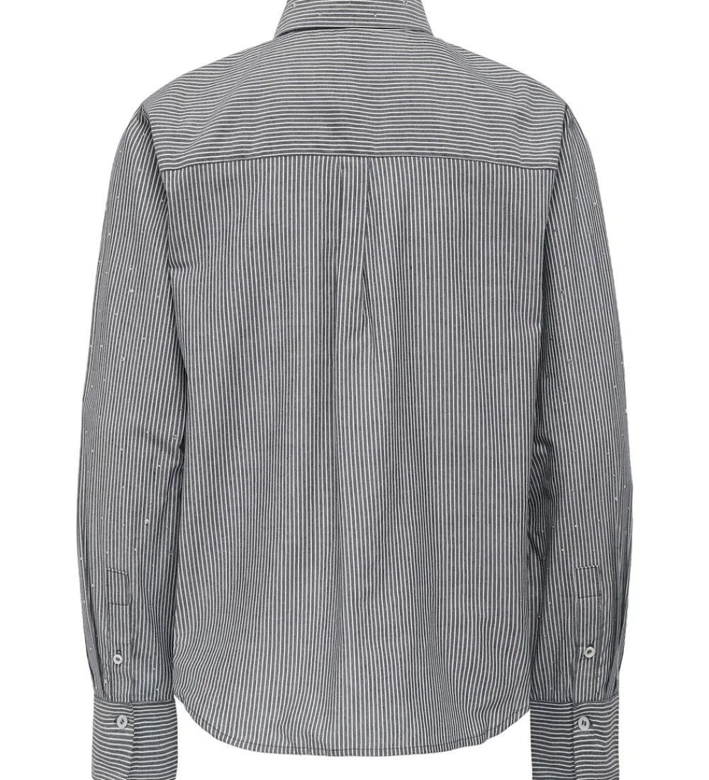 Stilfuld Kids Only skjorte stribet mørkeblå og hvid med små similisten i sølv på fronten og på ærmerne. Skjorten har en klassisk krave og gennemgående knapper fortil. Den har lange ærmer med manchetknapper ved håndleddende og i bunden er den længere bagtil.