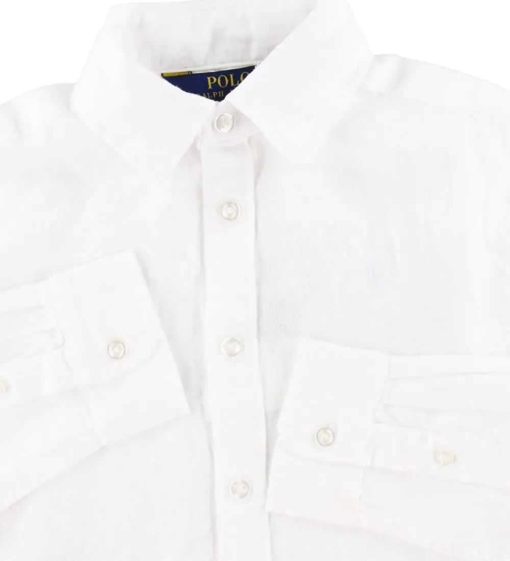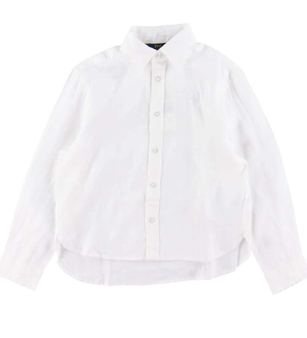 Polo Ralph Lauren skjorten har lange ærmer med brede kanter og to små knapper. I halsåbningen er der en klassisk krave, og skjorten åbens med hvide knapper.