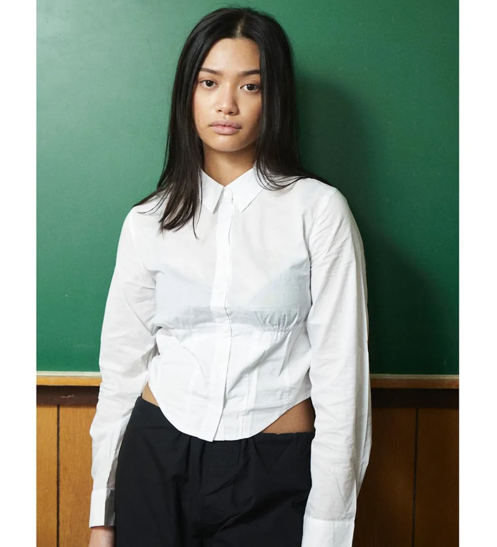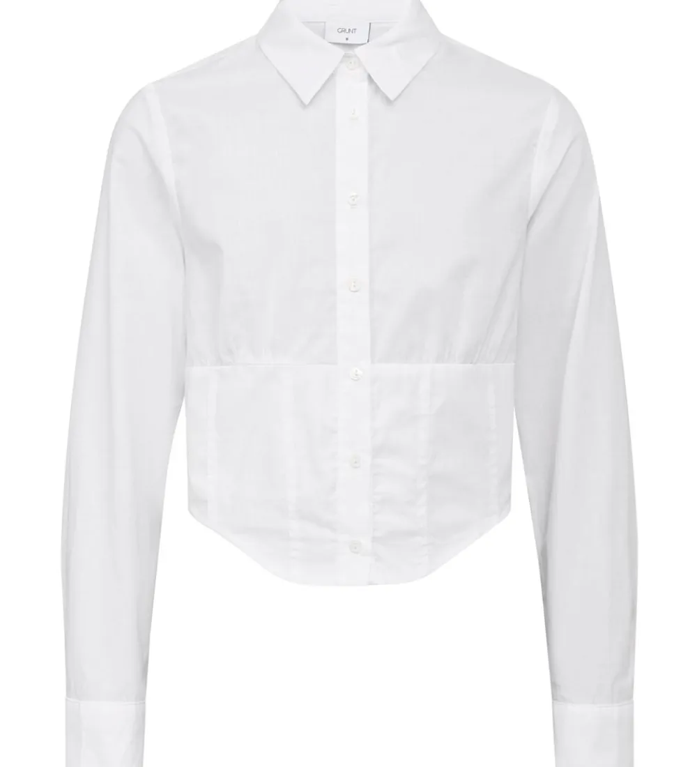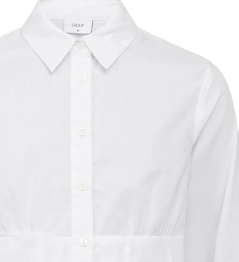 Grunt skjorten har lange ærmer med manchetter, der lukkes med knapper. Skjorten har en klassisk krave, og den åbnes fortil med gennemgående knapper. Fortil er der dekorative syninger, og bagpå er der en smocksyning, som giver skjorten en god pasform og fine folder.
