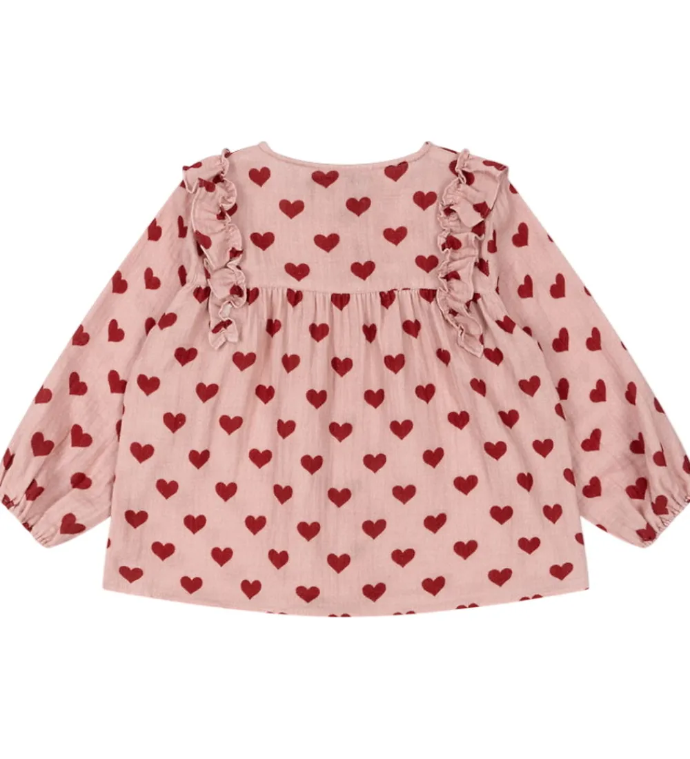 Charmerende Konges Sløjd skjorte med musselinstruktur og lange ærmer i en blød, rosa nuance med et print af røde hjerter. Skjorten har fine flæsedetaljer langs brystet og knaplukning foran. Konges Sløjd sikrer en behagelig pasform, der udstråler en sød stil.