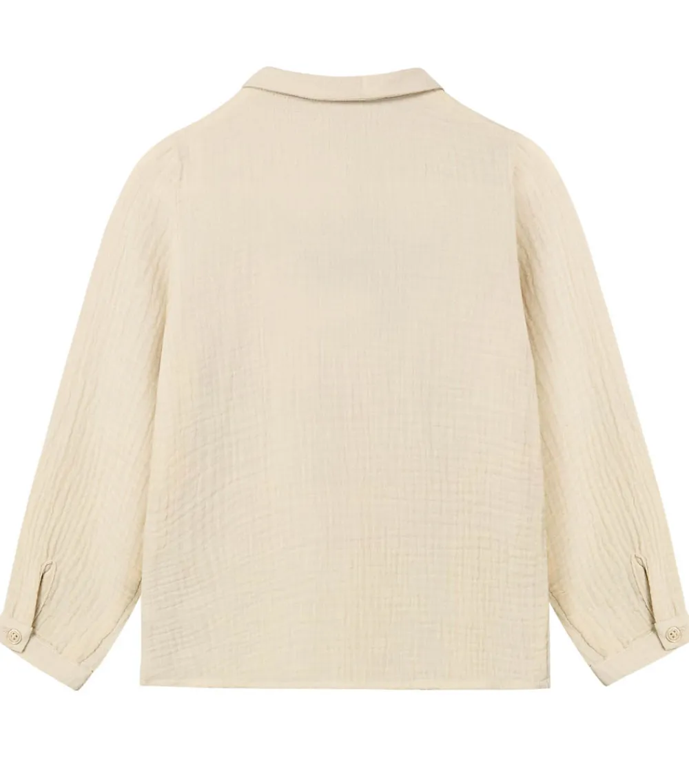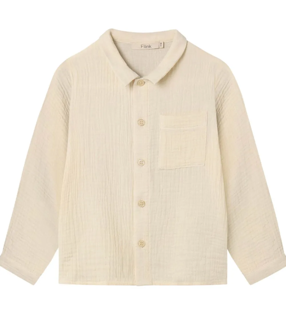 Charmerende Fliink skjorte i beige musslin. Skjorten har lange ærmer og en klassisk krave. Den lukkes fortil med gennemgående knapper, og fortil er der en brystlomme i venstre side.