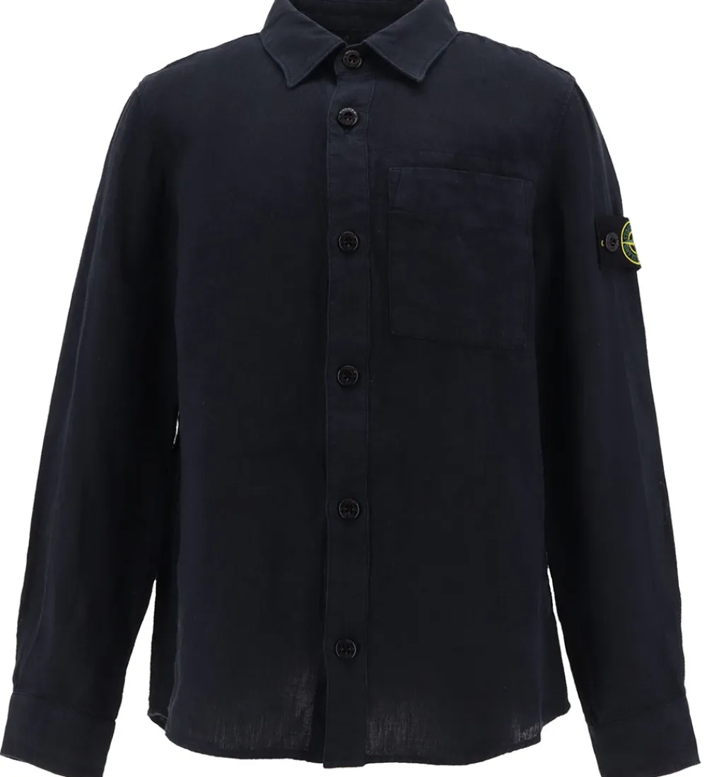 Flot Stone Island skjorte i ensfarvet navy hør i en fasttvævet kvalitet, og øverst på venstre ærme sidder det ikoniske logomærke fast med knapper.