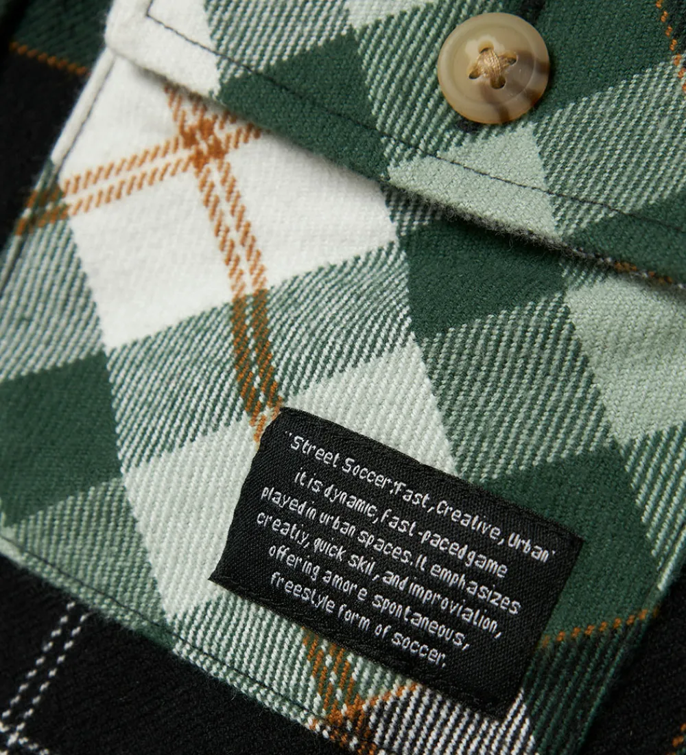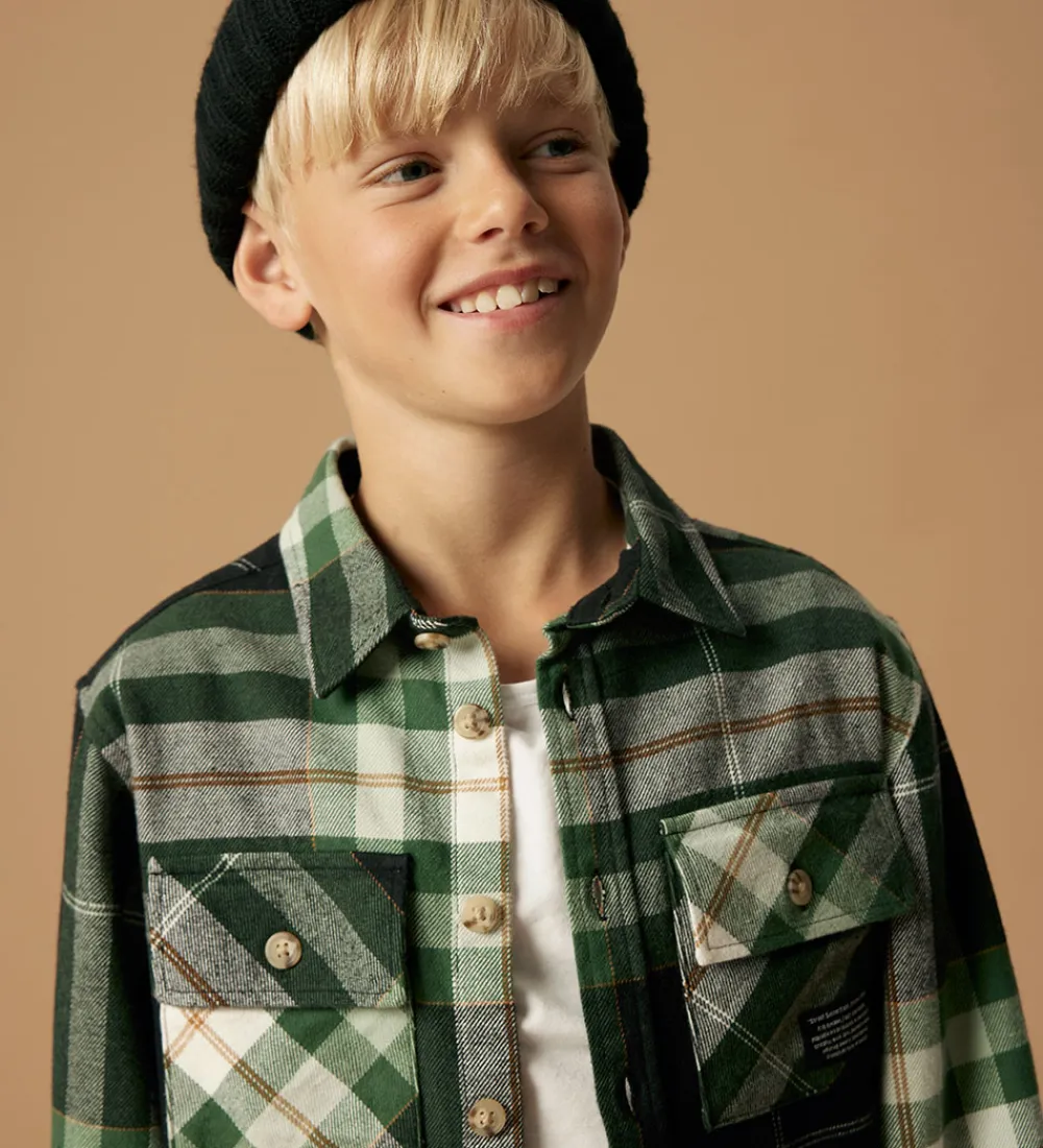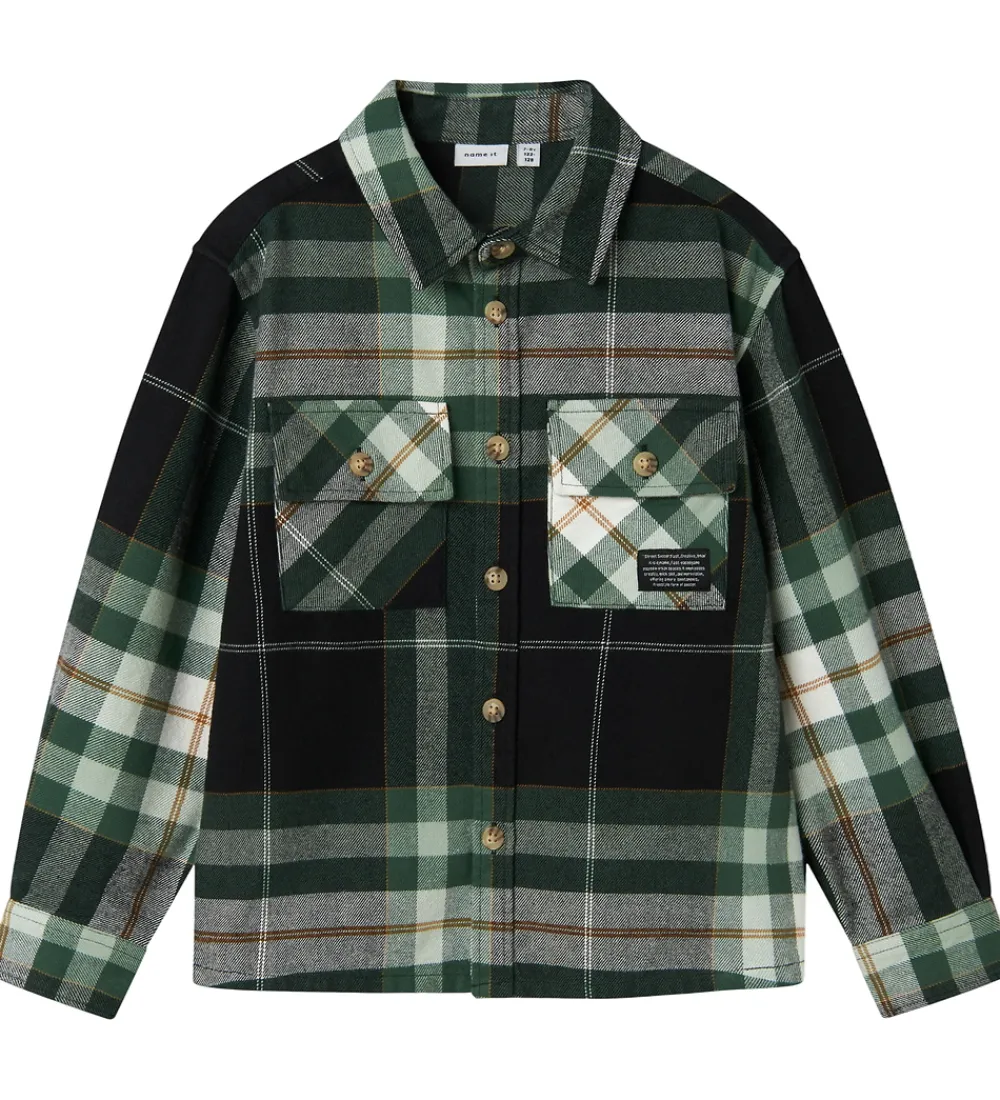 Stilfuld Name It skjorte i kraftig, blød bomuldskvalitet med ternet mønster i sort, grøn, brun og hvid. Skjorten har en klassisk krave, lange ærmer og praktiske knapper langs fronten. Den er forsynet med to brystlommer med knaplukning.